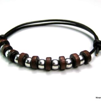 Bracelet homme cordon lien cuir perles rondelles bois marron composé de 5 rondelles en bois marron montées sur un double cordon de cuir naturel (2 mm de diamètre).