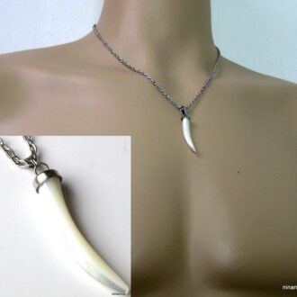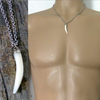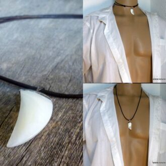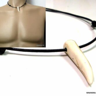 Collier griffe de tigre nacre homme cordon cuir composé d’un pendentif dent de tigre en nacre blanche et métal argenté monté sur un cordon de cuir noir (2 mm de diamètre).