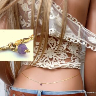 Cette chaine avec pierre de naissance de grande qualité est unique et fabriquée à la main, de façon artisanale dans notre atelier en France. Il s’agit d’une pièce faite sur mesure et ajustable en longueur afin de se poser au mieux sur vos hanches et de s’adapter à vos mensurations, Elle est proposée en 3 longueurs dans le menu déroulant : 75 cm env (tailles 36 à 38) – 85 cm env (tailles 40 à 42) ou 95 cm env (tailles 44 à 46).