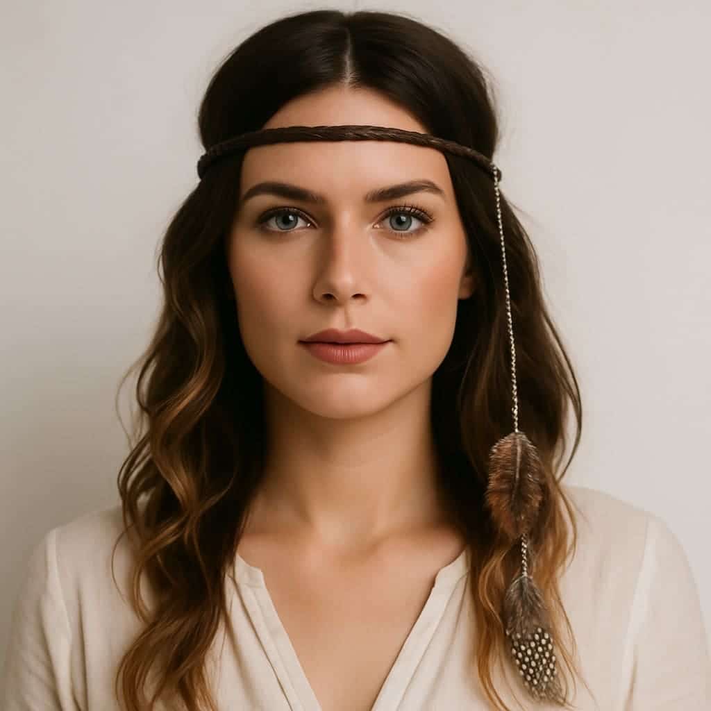 Ce head band femme cuir tressé avec plumes évoque la liberté et l’élégance des looks bohèmes.