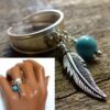 Grâce à sa pierre en turquoise naturelle de toute beauté, cette bague avec plume qui pend sera également un cadeau exceptionnellement glamour et tendance à offrir pour une occasion toute particulière comme la St Valentin ou le cadeau parfait pour les Noces de Turquoise qui célèbrent le 18ème anniversaire de mariage.