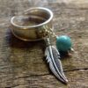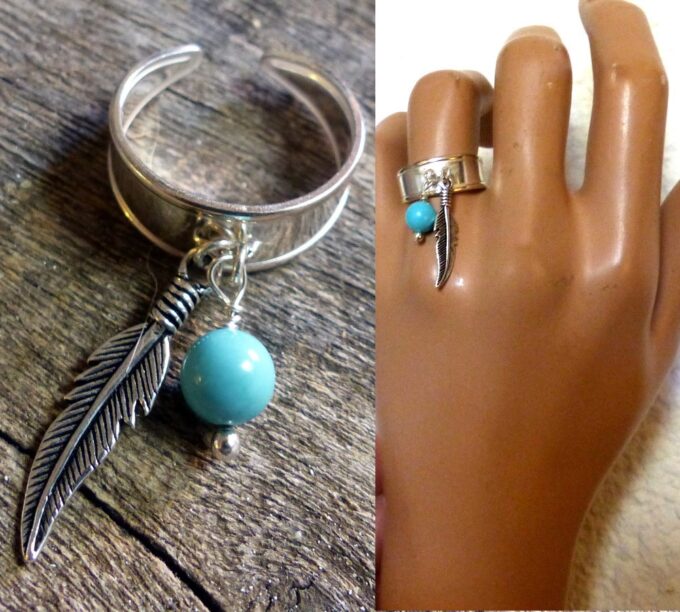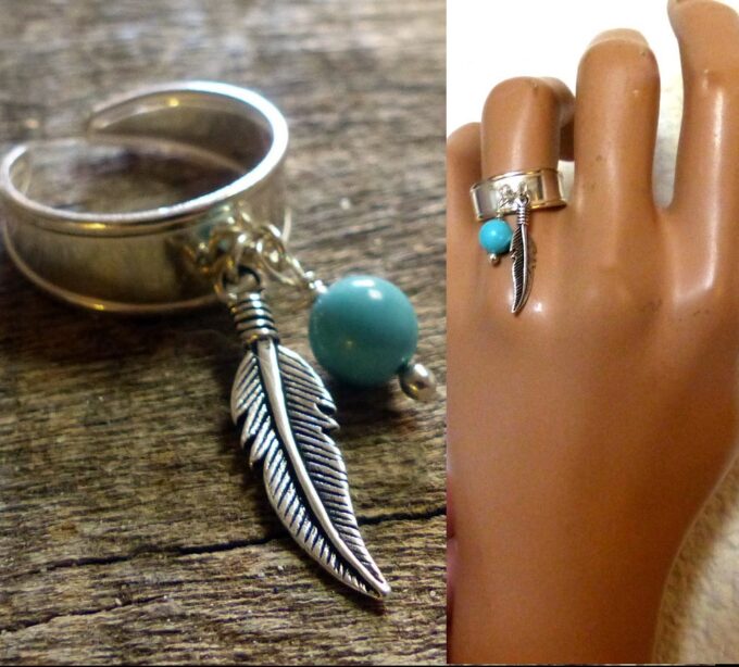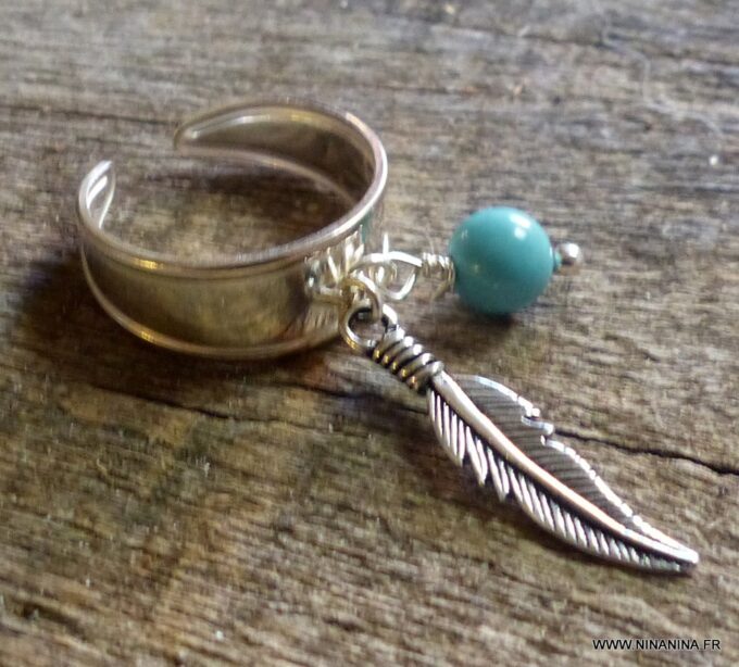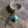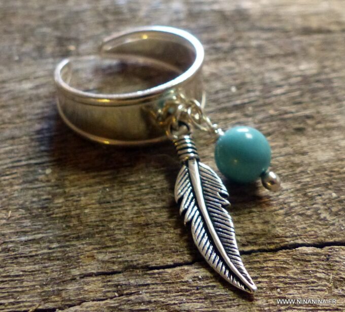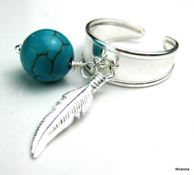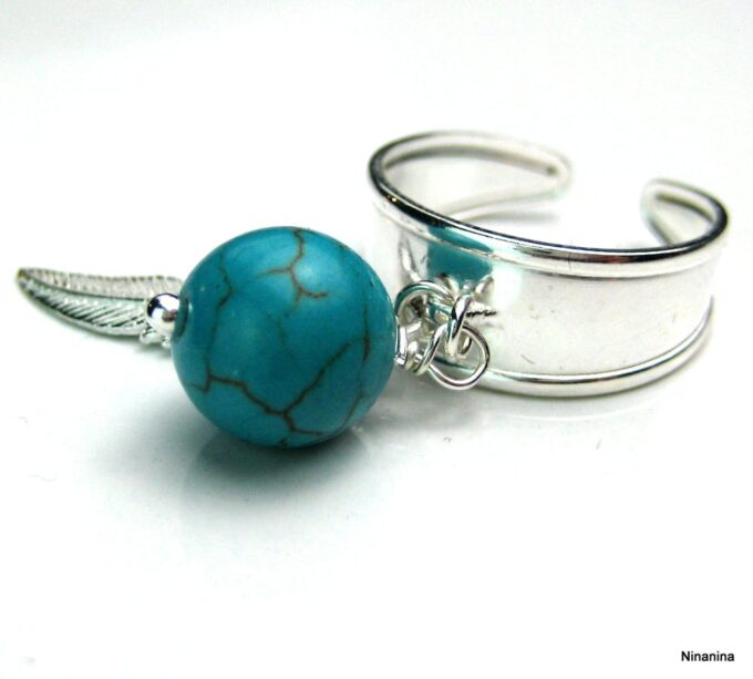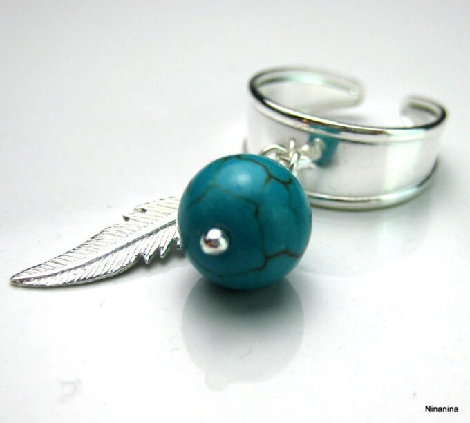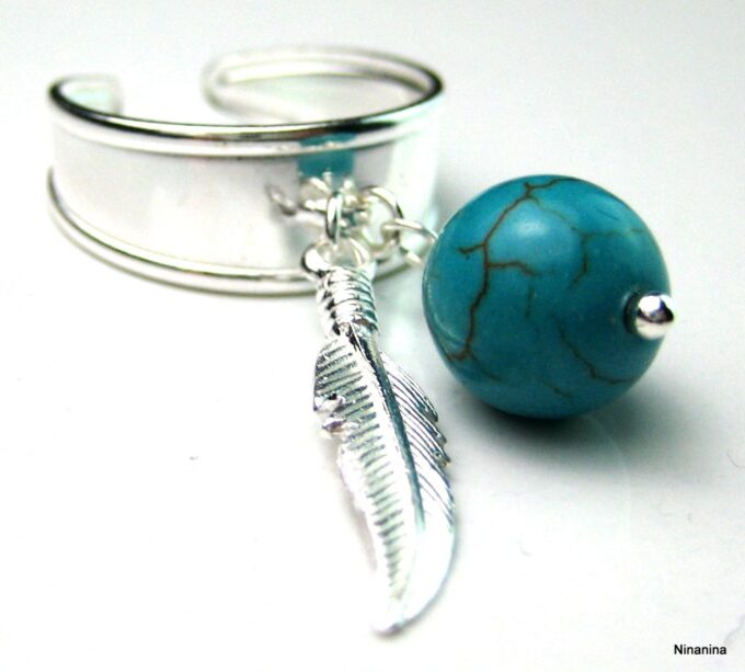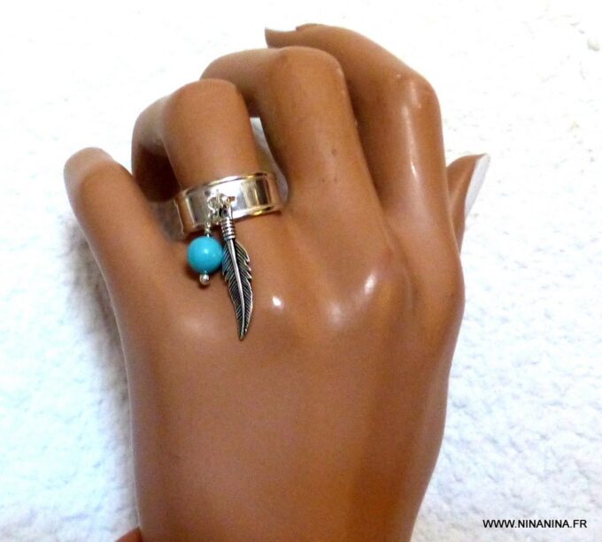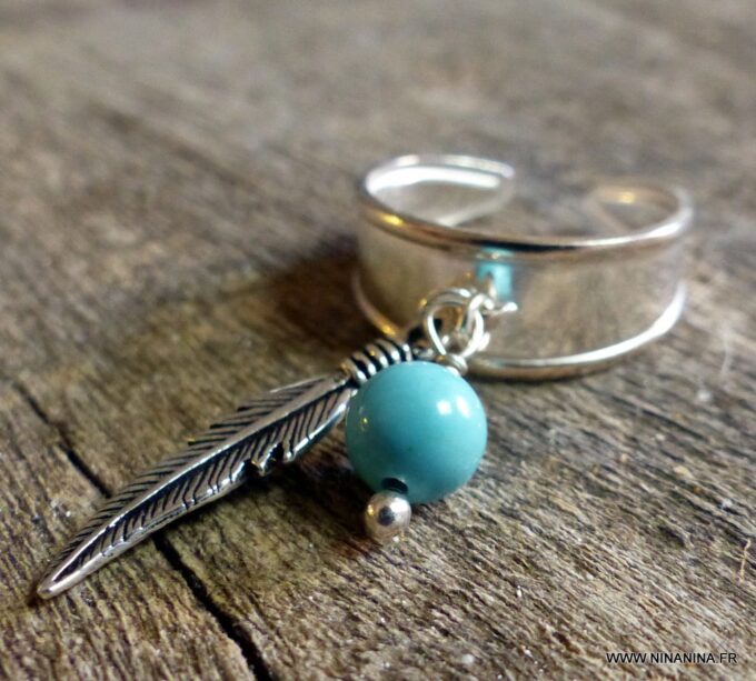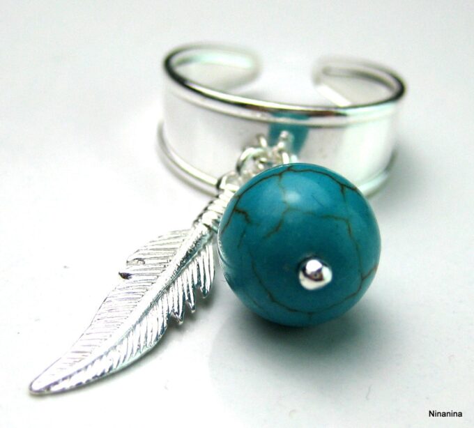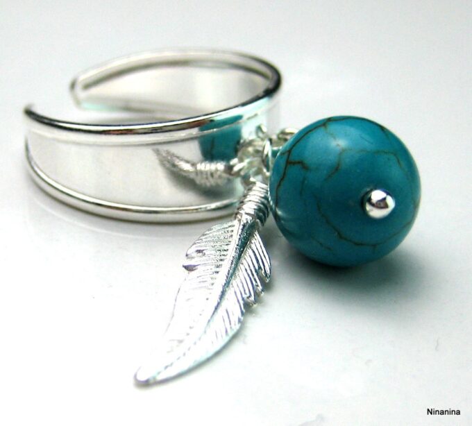 Cette jolie Bague breloque plume et sa pierre bleue turquoise de haute qualité est unique et fabriquée à la main, de façon artisanale. Chaque pièce faite sur mesure.