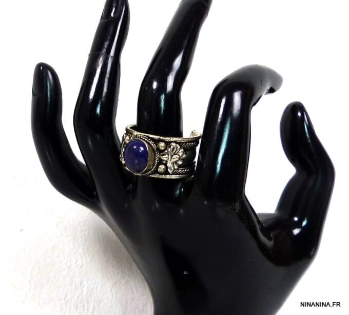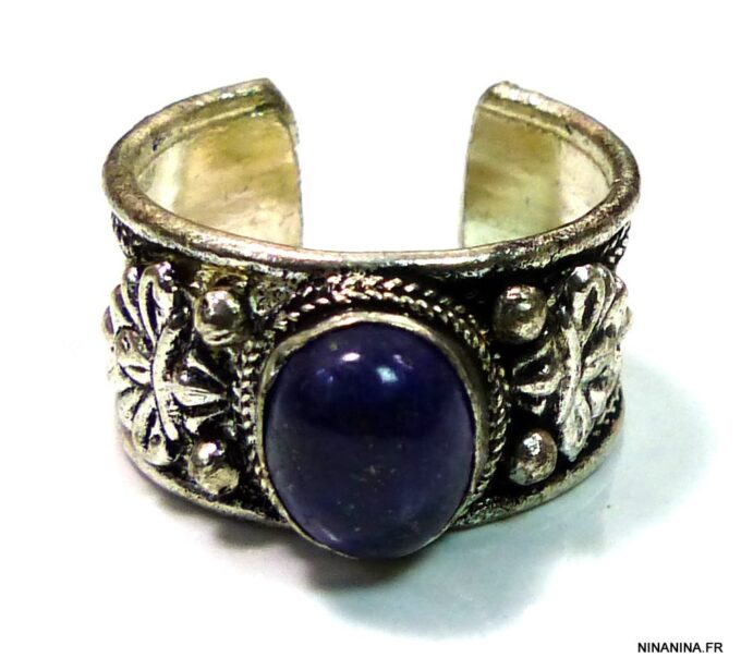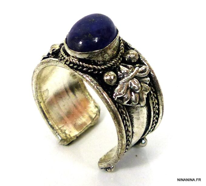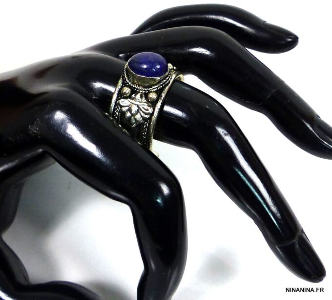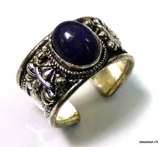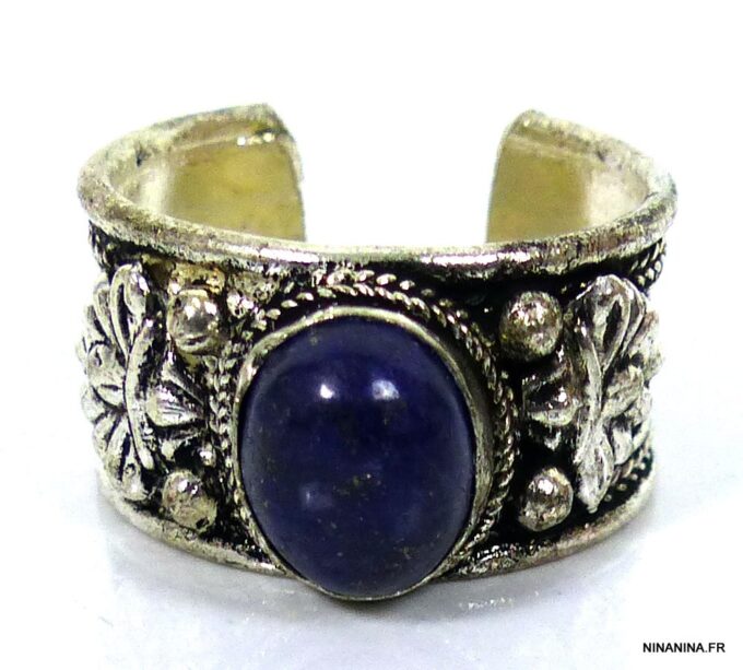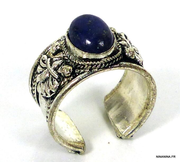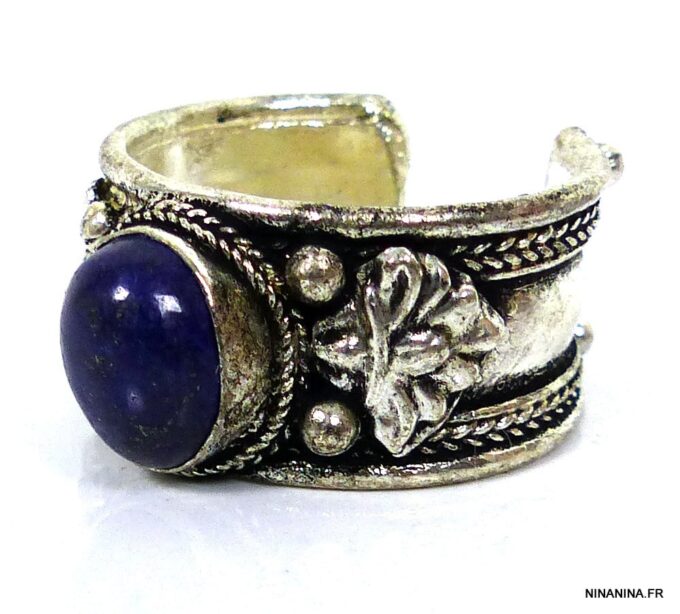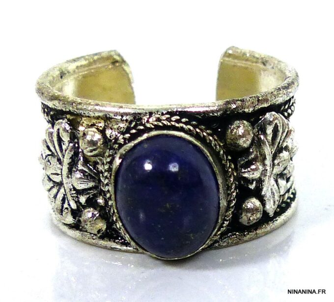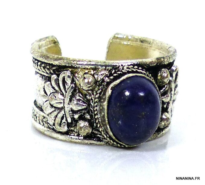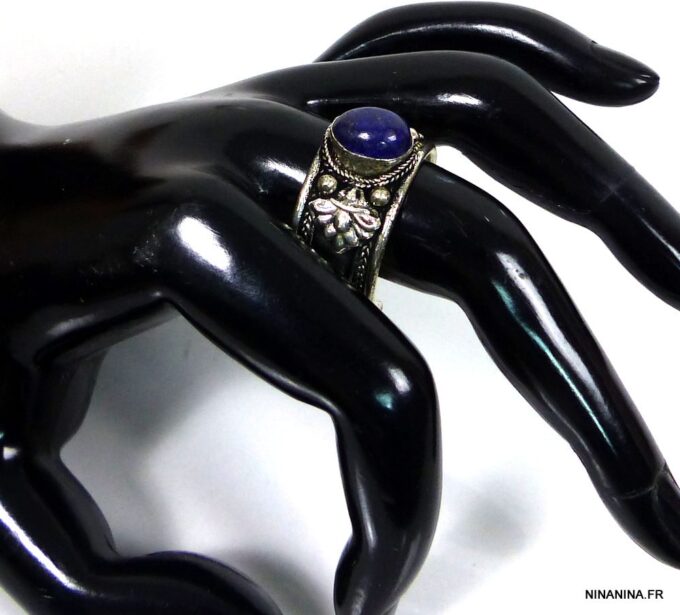 Bague réglable ethnique lapis lazuli métal argent ornée d’une lapis lazuli ronde.