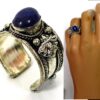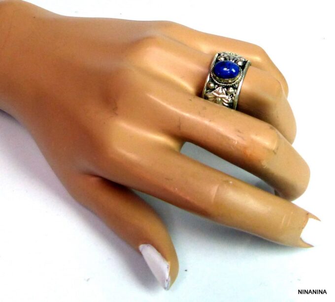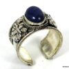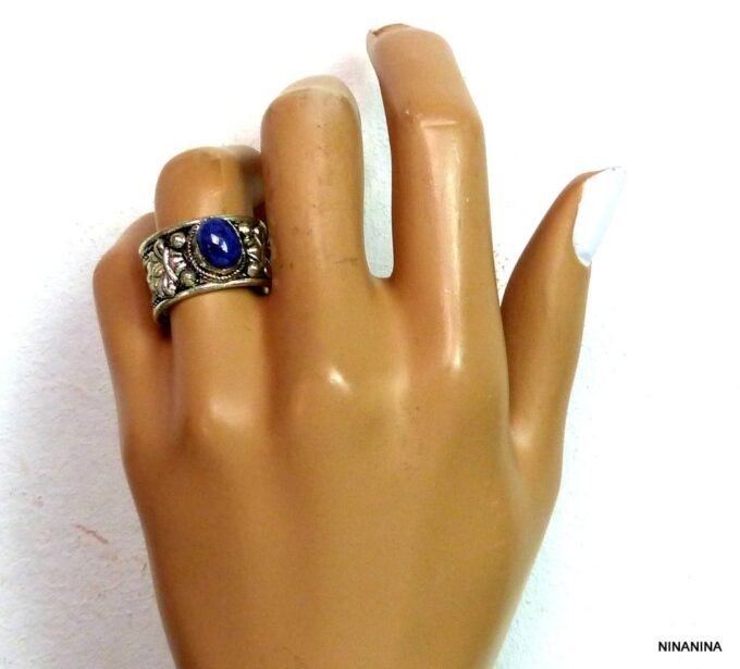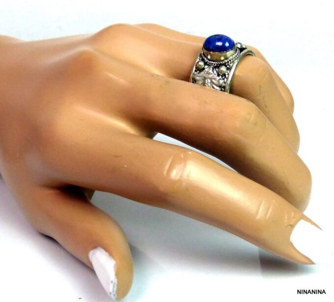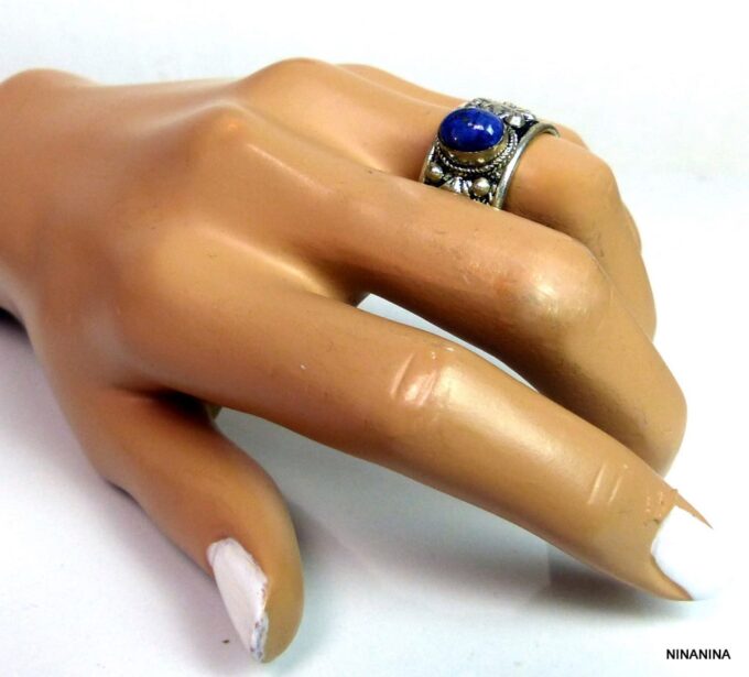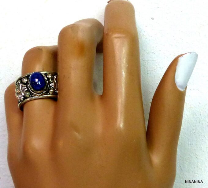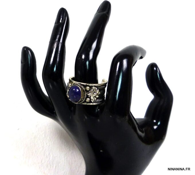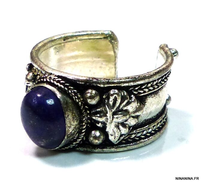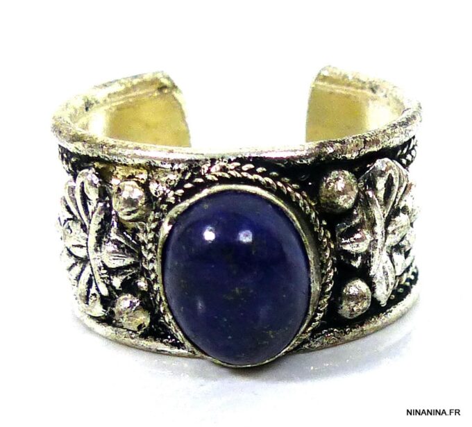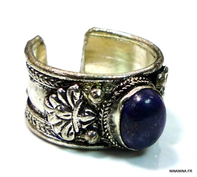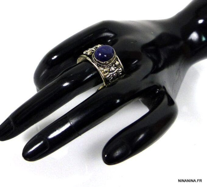 Bague réglable ethnique lapis lazuli métal argent ornée d’une lapis lazuli ronde.