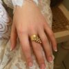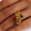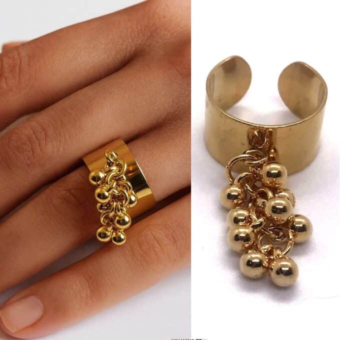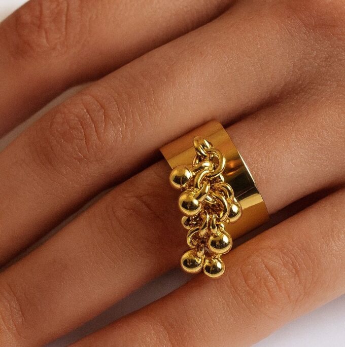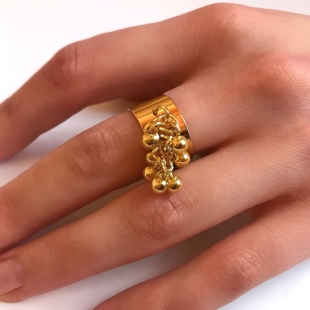 Cette bague dorée artisanale dorée se distingue par son design audacieux et raffiné. Son anneau large et réglable, à la finition dorée lumineuse, accueille un pendentif en grappe de petites perles rondes dorées, qui créent un joli mouvement à chaque geste de la main.