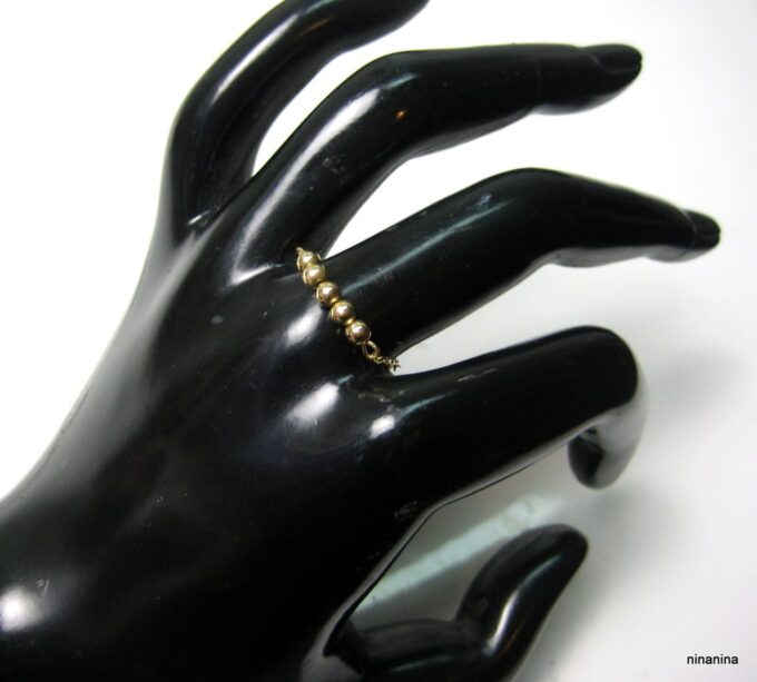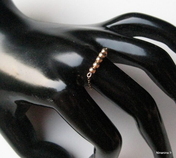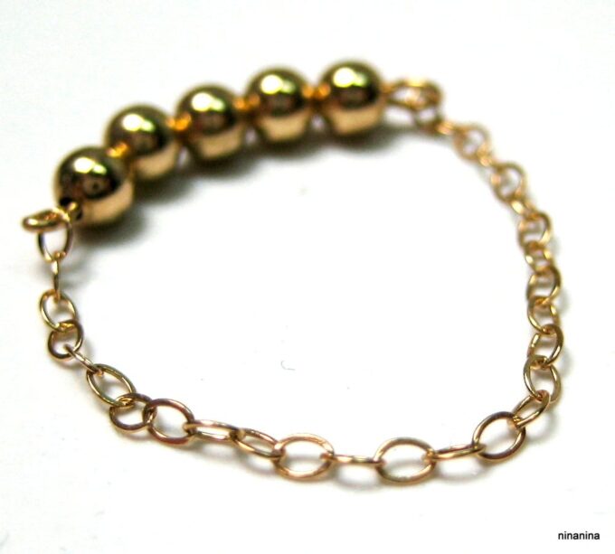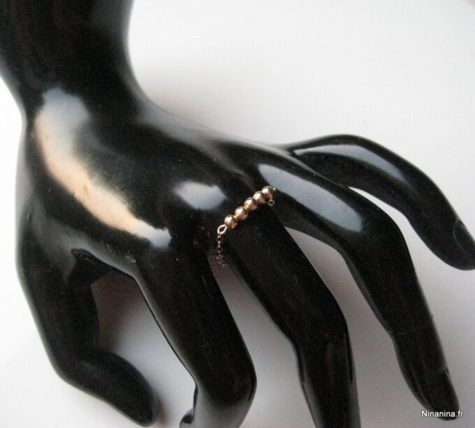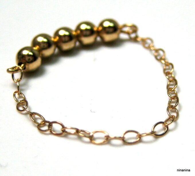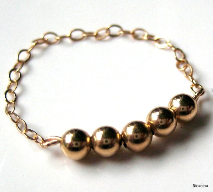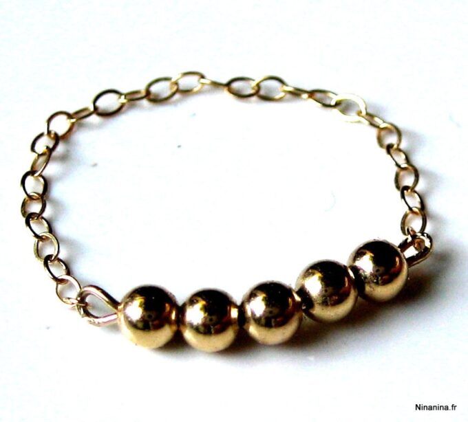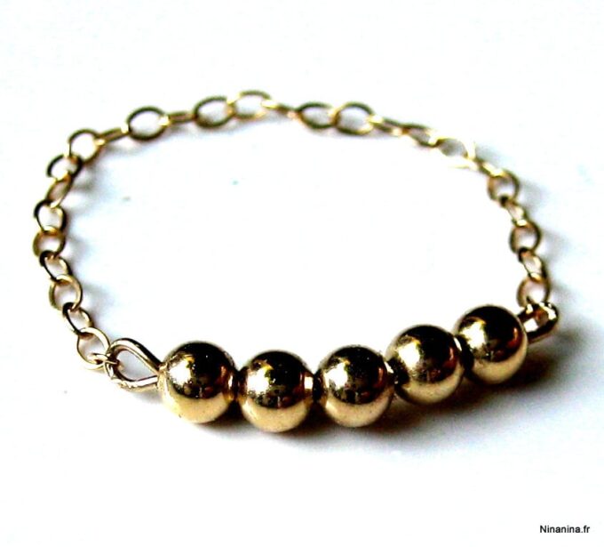 Découvrez sans plus attendre cette Bague chaine perle chainette plaqué or 14 carats composée de 5 perles rondes en plaqué or 14 carats montées sur une fine chaînette en plaqué or 14 carats !