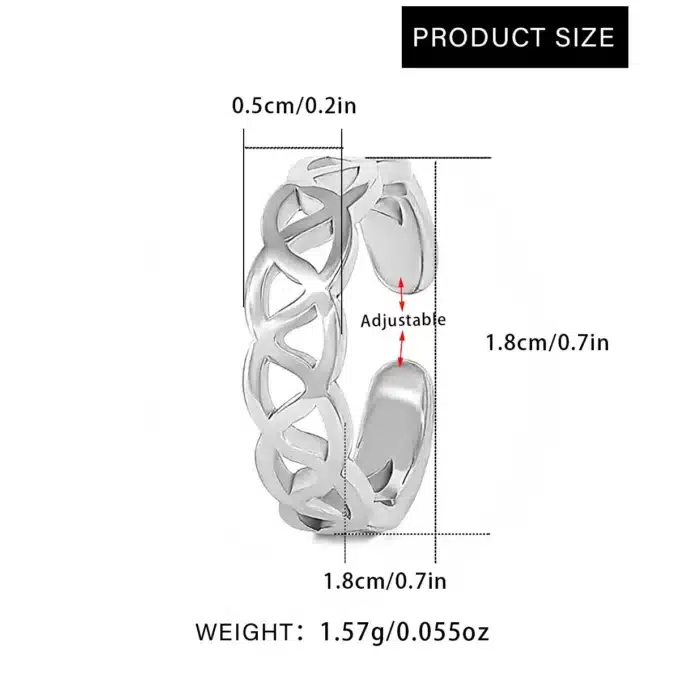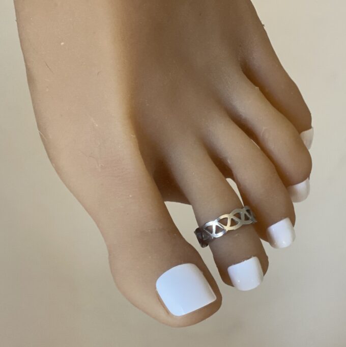 Sublimez vos orteils ou vos phalanges avec cette Bague Doigt Pied Acier Inoxydable Orteil ou Phalange ! Cette bague d’orteil se compose d’un anneau réglable au motif tressé en acier argenté de 5mm de large.