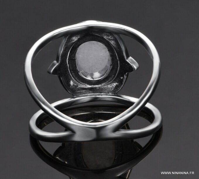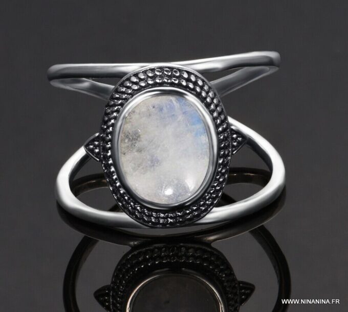 Vous allez être séduit par jolie Bague pierre de lune véritable et argent 925 femme composée d’un cabochon de forme ovale en pierre de lune blanche montés sur un double anneau en Argent 925 massif qui enlacera votre doigt avec force et délicatesse. Cette bague élégante en Pierre de Lune accompagnera avec harmonie toutes vos tenues dans n’importe quelle occasion et offrira à votre main charme et originalité. A porter seule ou à mixer avec d’autres Bagues en Argent Ninanina.