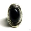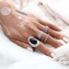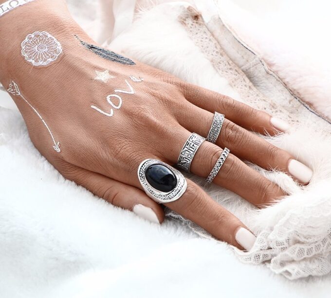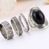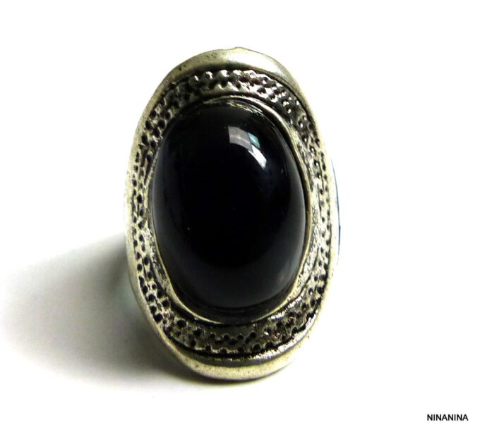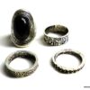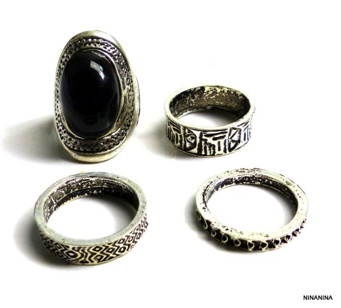 Set de 4 bagues bohème en métal argenté et résine noire. Diamètre : 16,8 et 16,5 mm. Livré dans sa pochette d’organza.