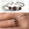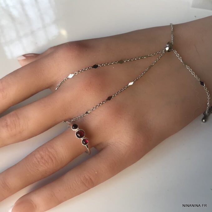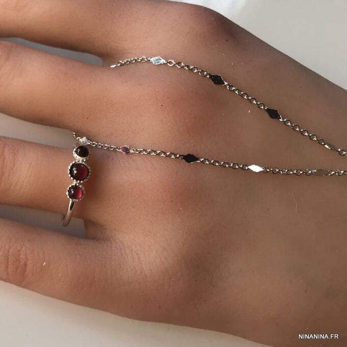Cette jolie Bague en grenat et argent de haute qualité est unique et fabriquée à la main, de façon artisanale. Chaque pièce faite sur mesure. Largeur de l’anneau : 0,2 cm. Diamètre : 1,8 cm env réglable. Dim des pierres : 3 et 4 mm. A personnaliser avec les pierres de votre choix.