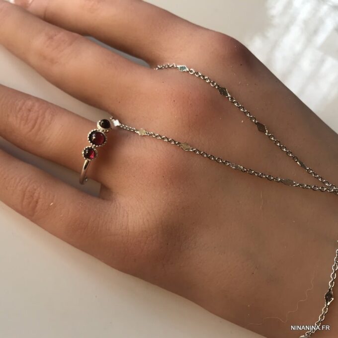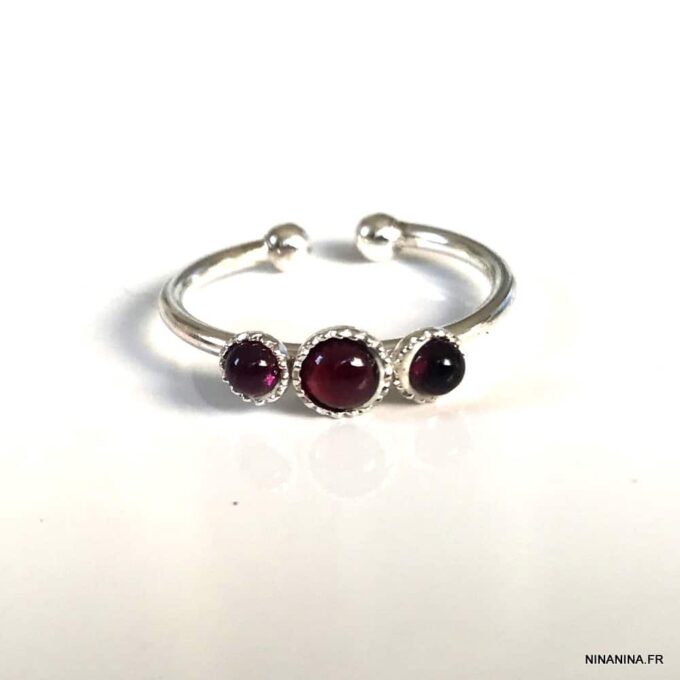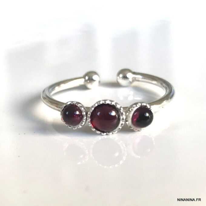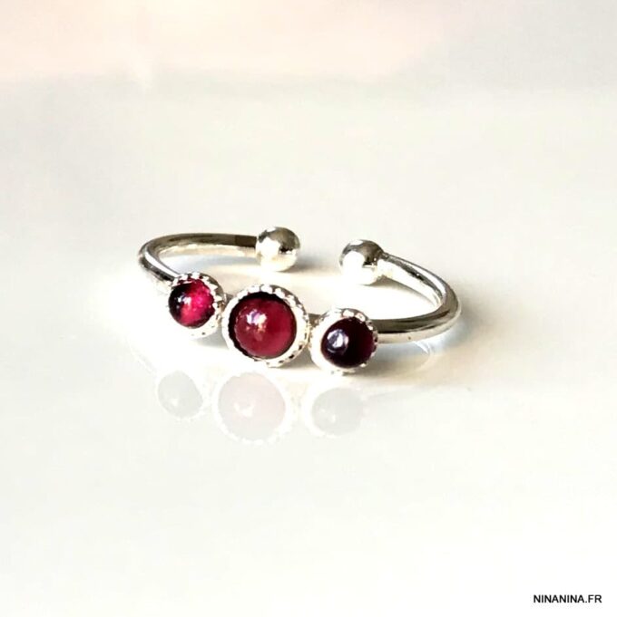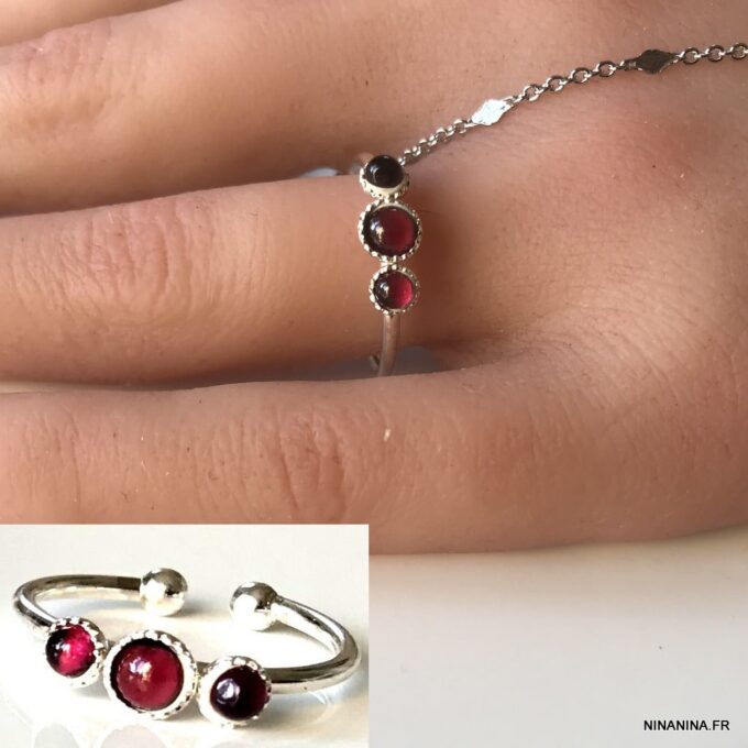 Vous allez craquez pour cette Bague jonc Argent réglable Grenat personnalisable! Composée de 3 petits cabochons de 3 et 4 mm en grenat rouge naturel sertis sur un anneau réglable en argent 925 terminé par deux petites boules, elle vous ravira à coup sûr. Présentée avec des pierres en grenat rouge, elle peut être personnalisée avec d’autres pierres sur simple demande.