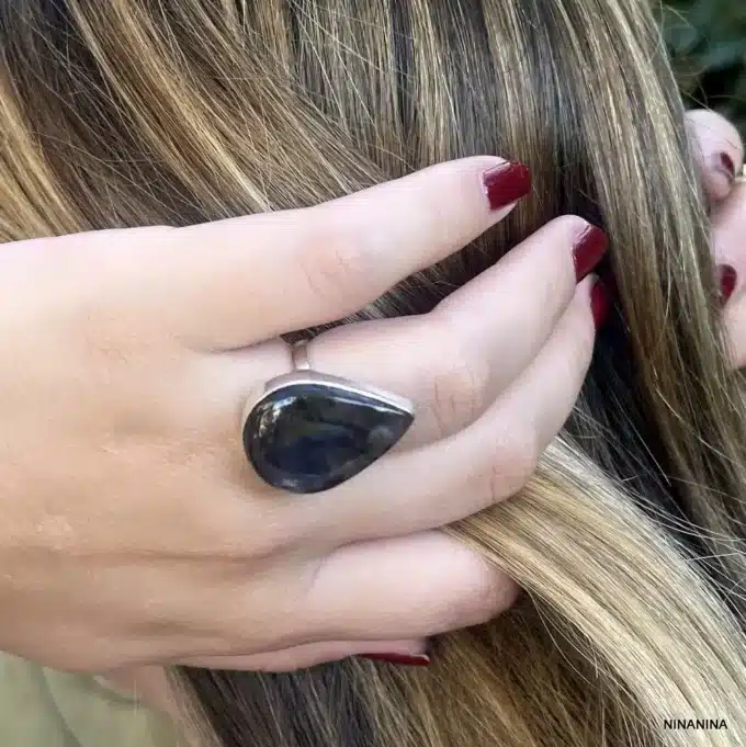 Avec ses extraordinaires jeux de couleurs dus aux phénomènes d’adularescence, cette bague élégante en Labradorite accompagnera avec harmonie toutes vos tenues dans n’importe quelle occasion et offrira à votre main charme et originalité. A porter seule ou à mixer avec d’autres Bagues en Argent Ninanina.