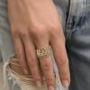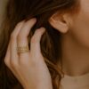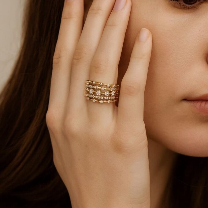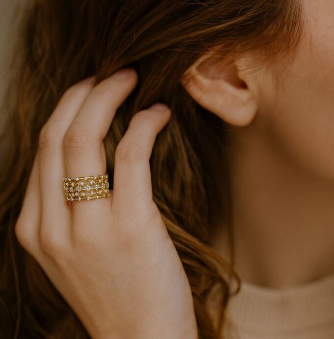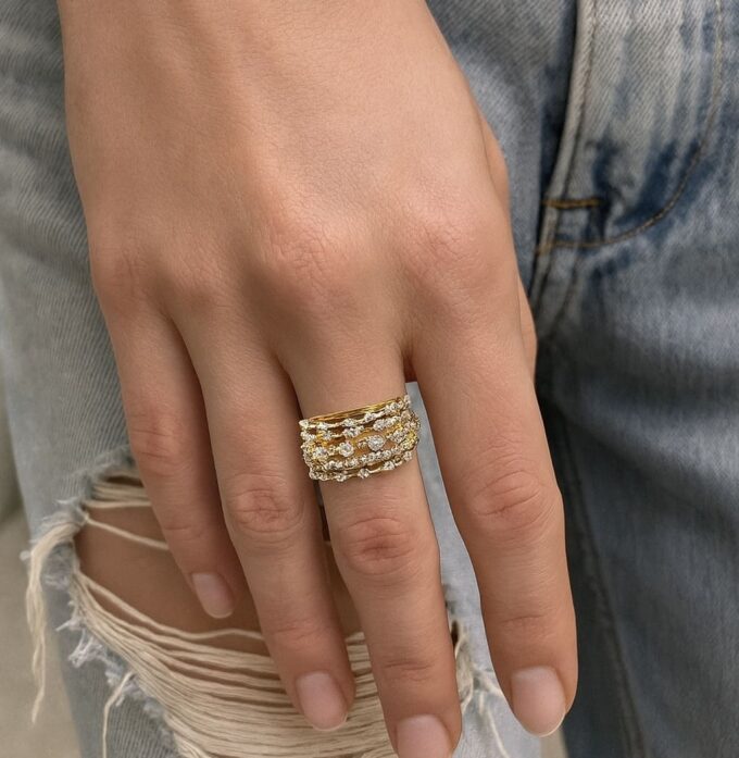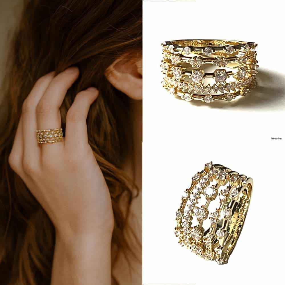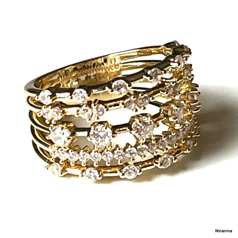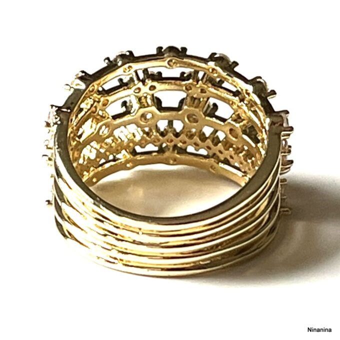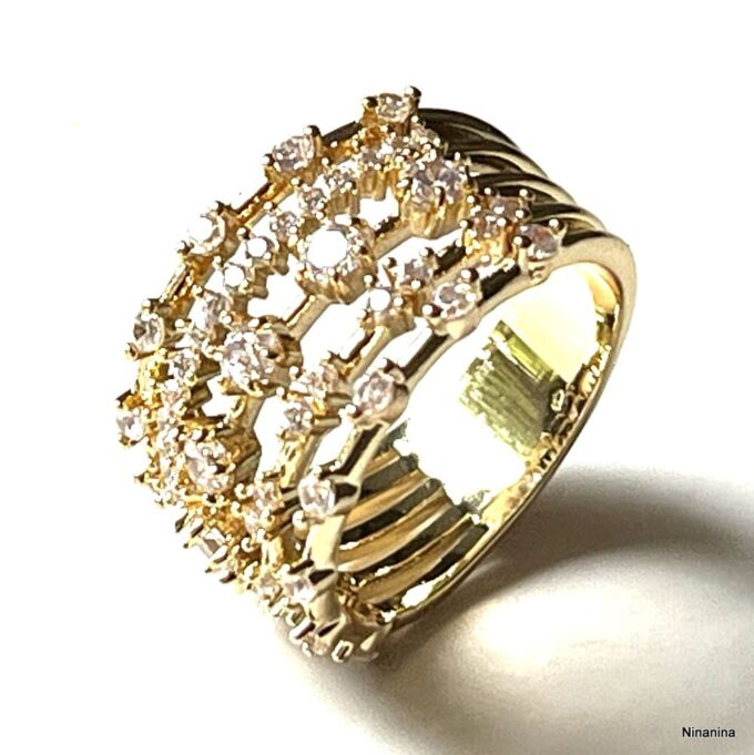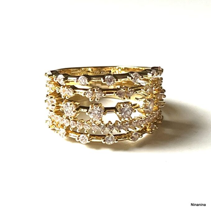 L’alternance des tailles et des formes de zirconiums apporte profondeur, relief et brillance à cette bague. Les sertis minutieux, répartis sur les cinq rangs dorés, créent une harmonie parfaite entre modernité et glamour. Cette construction multi-rangs donne un effet d’anneaux superposés, très tendance, tout en formant une seule pièce solide et parfaitement équilibrée.