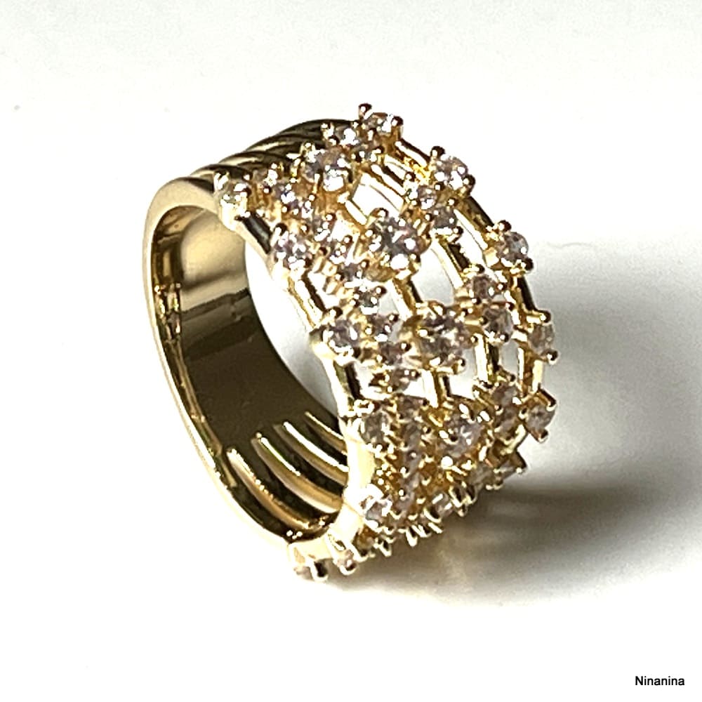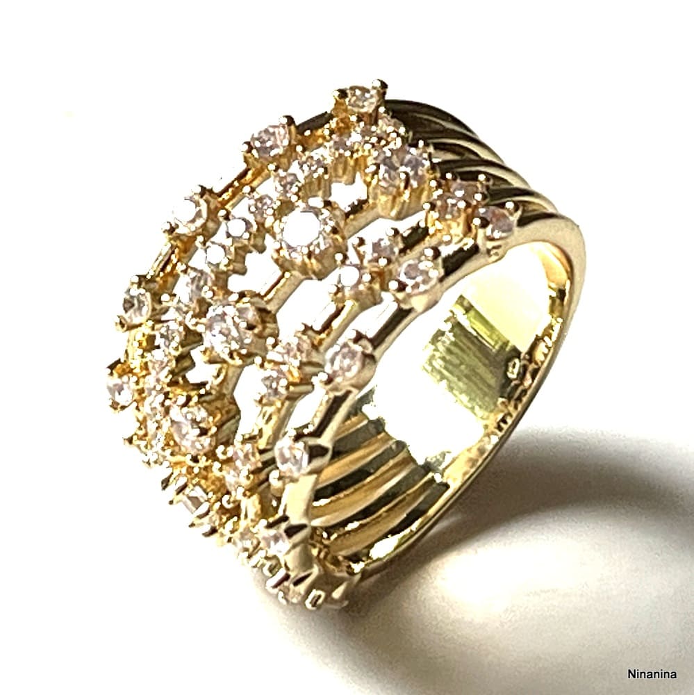 Cette superbe bague 5 rangs en laiton doré est une véritable pièce de caractère, conçue pour offrir un éclat incomparable. Sa structure large et ajourée donne un effet de superposition luxueuse tout en restant légère à porter. Chaque rang accueille des zirconiums scintillants de formes différentes – ronds, ovales, ou délicatement taillés – créant un jeu de lumière riche et dynamique.