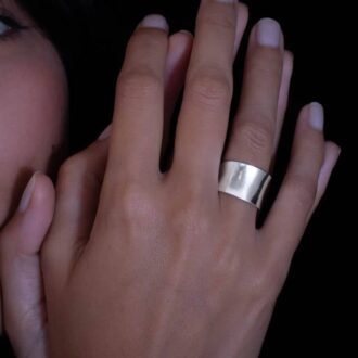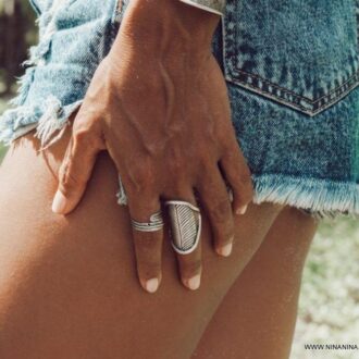 Belle bague évasée, fruit de l’artisanat karen, du nom de cette tribu du sud-est asiatique, dont le savoir faire en matière de bijouterie a inspiré de nombreux courants de mode. La Bague ethnique évasée argent 925 massif ajustable en argent ciselé couvre le doigt tout en longueur, et nous fait admirer ses dessins de triangles délicats.