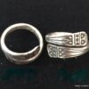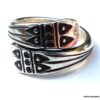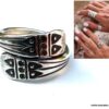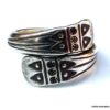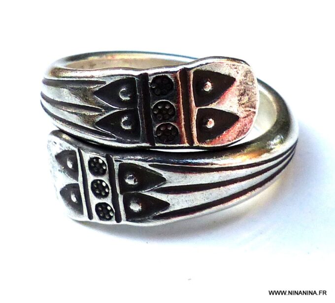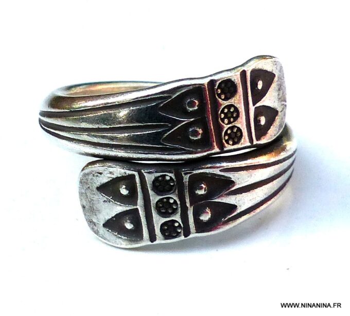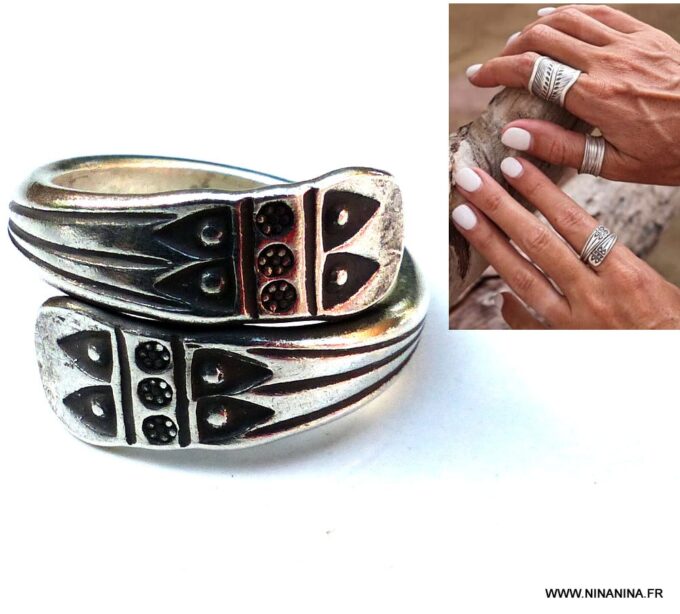 Bague large boheme réglable argent 925 massif constituée d’un anneau gravé fleurs et triangles incurvé en argent 925
