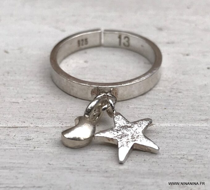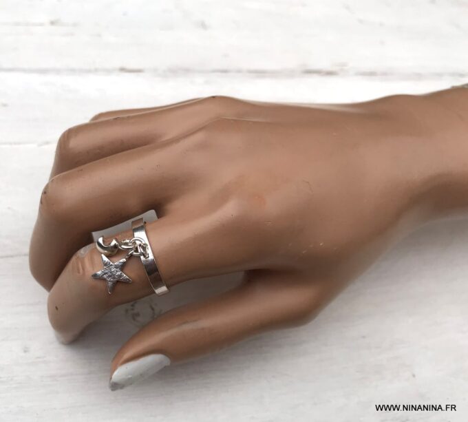 Offrez un look bohème chic à votre doigt avec cette Bague lune etoile argent 925 réglable pour femme composée de breloques en argent 925 en forme de croissant de lune et d’étoile montées sur anneau réglable en argent 925. Une Bague réglable en argent à la fois chic et tendance.