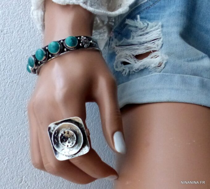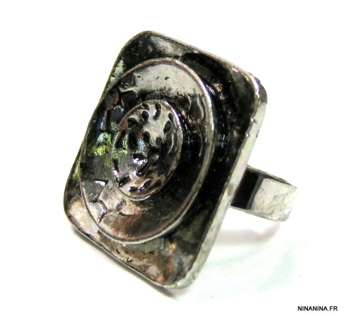 Bague réglable métal argenté carrée constituée d’une estampe carrée en métal argenté montée sur anneau ajustable.