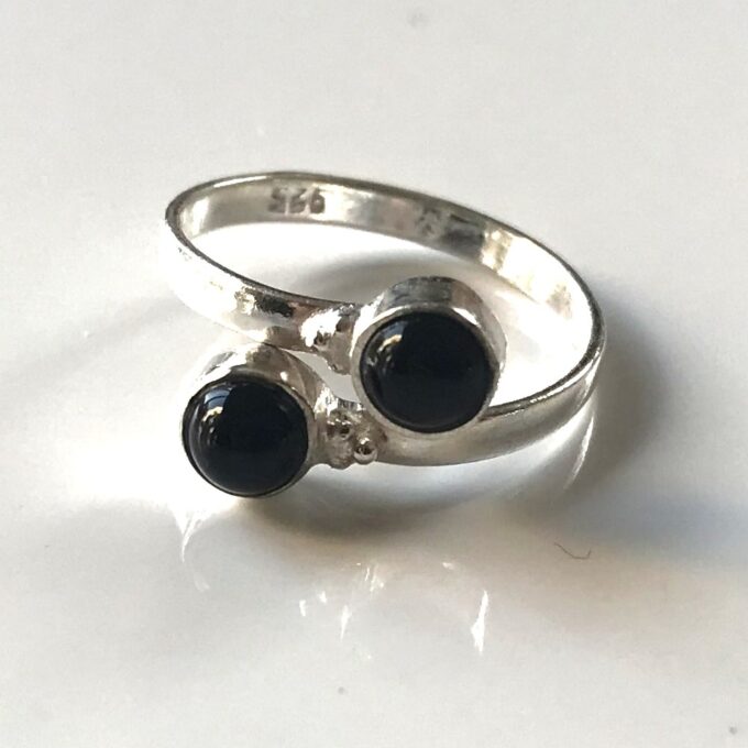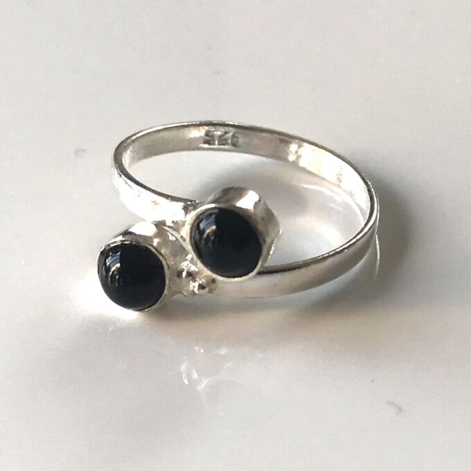 Le design ajustable de cette bague permet de l’adapter à différentes tailles de doigts, offrant ainsi un confort optimal. La bague est ornée de deux petites pierres onyx noires, qui ajoutent une subtile touche de contraste à l’ensemble. Les pierres sont soigneusement taillées et polies pour mettre en valeur l’éclat naturel de cette Bague en argent. Parfaite pour toutes les occasions, cette bague réglable est un choix idéal pour compléter votre collection de bijoux.