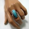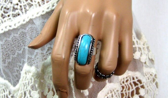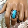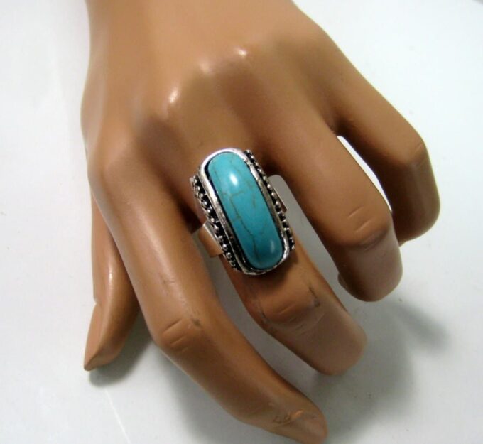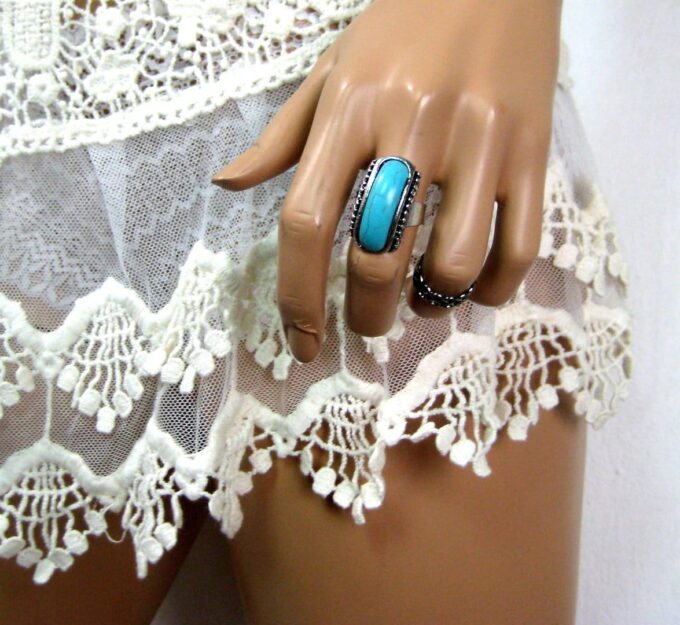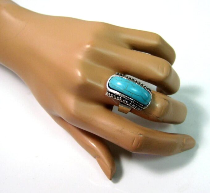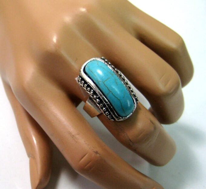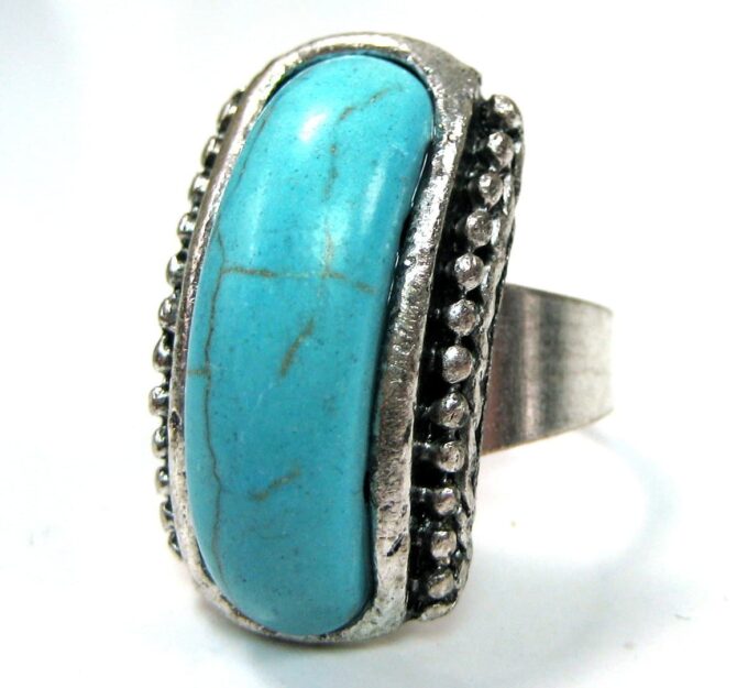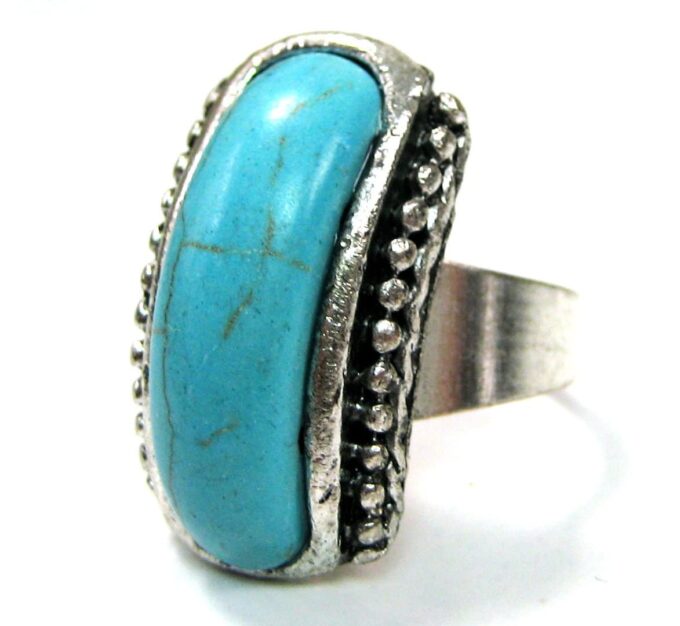 Bague ovale femme réglable howlite turquoise métal argenté. Hauteur : 3 cm. Largeur : 2 cm. Diamètre réglable. Livré dans sa pochette d’organza.