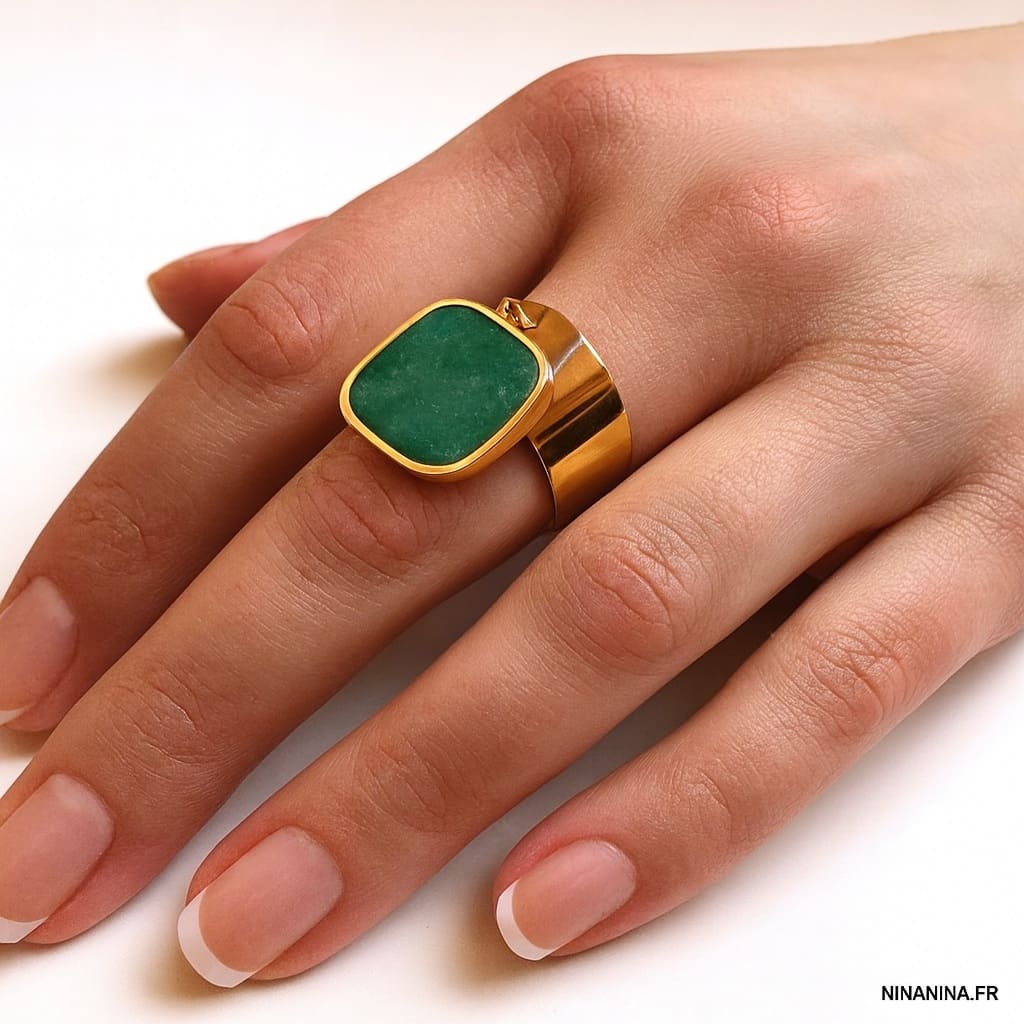 La pierre d’amazonite, appréciée pour son énergie apaisante et sa couleur captivante, contraste parfaitement avec la brillance chaude du métal doré. La forme carrée apporte un style graphique, contemporain et tendance, tandis que l’anneau réglable garantit un confort optimal et s’adapte à toutes les morphologies.
