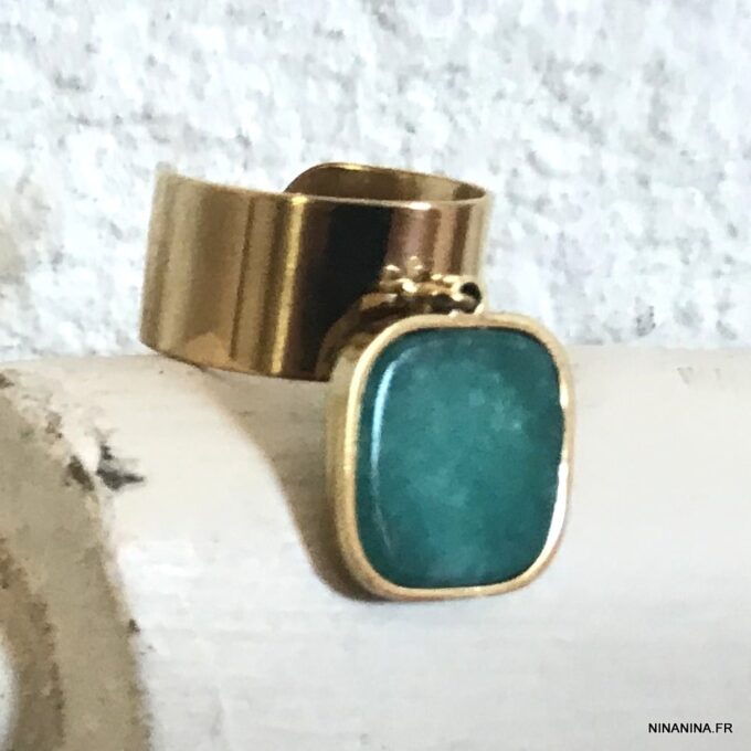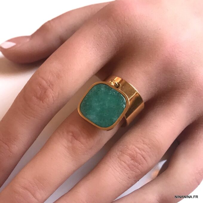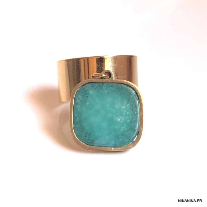 Pour amatrices de pierres fines, cette Bague pendentif acier inoxydable amazonite bleu habitera vos rêves jusqu’à ce que vous l’ayez au doigt! Une bague dorée qui laisse sa belle pierre bleue diffuser toute sa douce énergie et s’adaptera à chacun de votre doigts grâce à sa taille ajustable. A porter seule ou à mixer avec d’autres Bagues femme Ninanina!