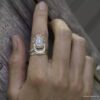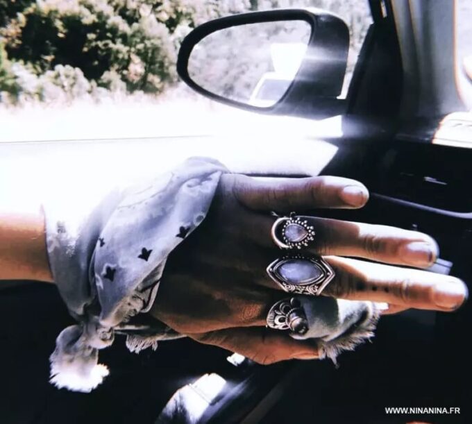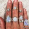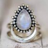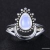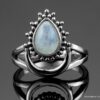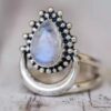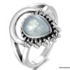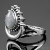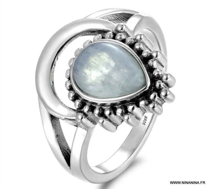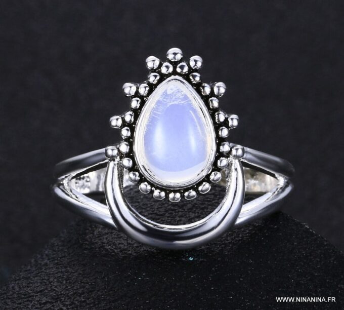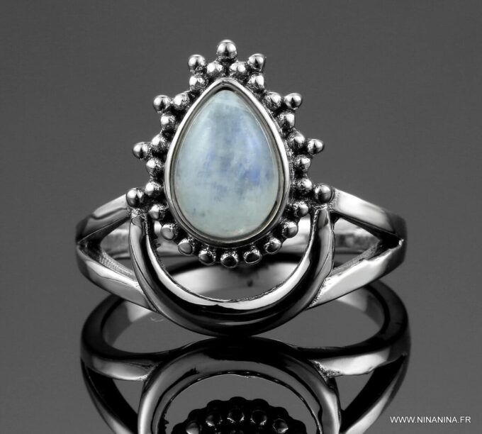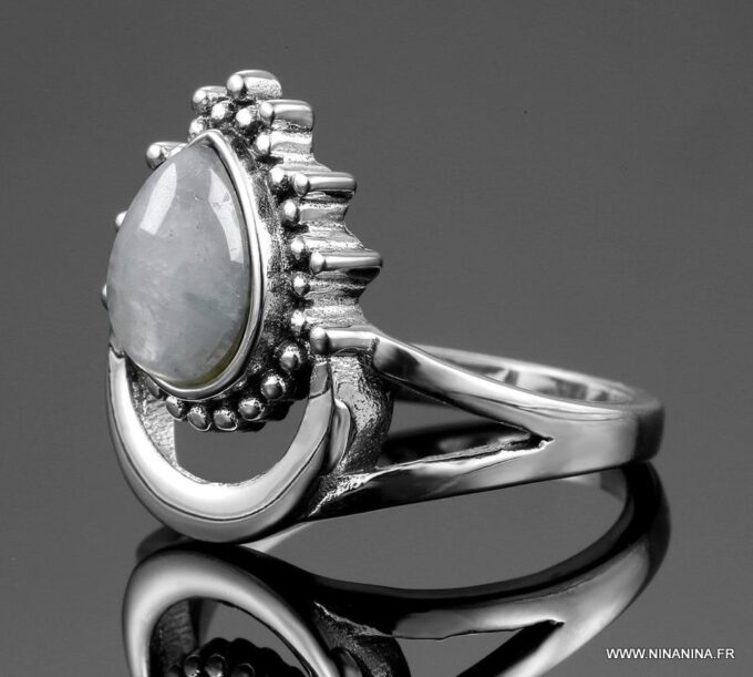 Bague pierre de lune blanche argent style boheme composée d’un cabochon de forme ovale ciselé en pierre de lune naturelle et plaqué argent 925