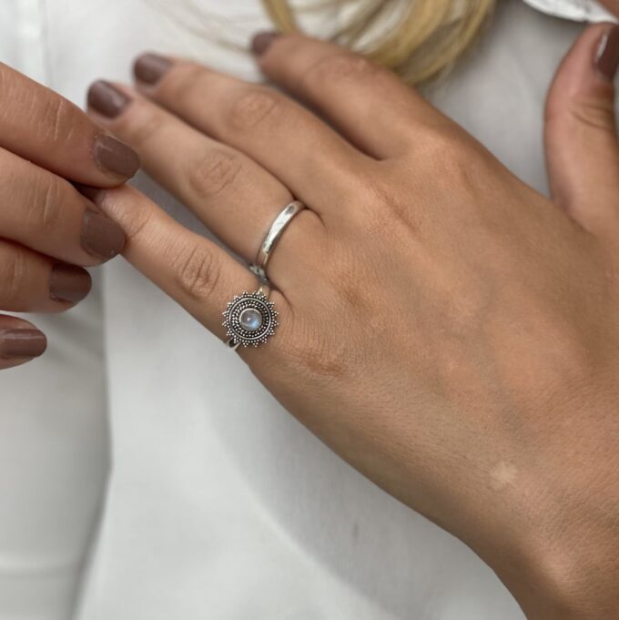 Bague pierre de lune femme argent 925 massif ronde composée d’un cabochon rond ciselé en pierre de lune naturelle