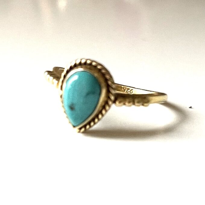 Look bohème original, envoûtement sans pareil d’une turquoise naturelle, cette Bague pierre turquoise naturelle forme goutte argent plaqué or sera sur le doigt comme une invitation au voyage! Les amoureuses de bijoux ethniques et de pierres fines y trouveront leur bonheur!