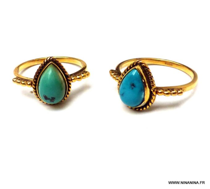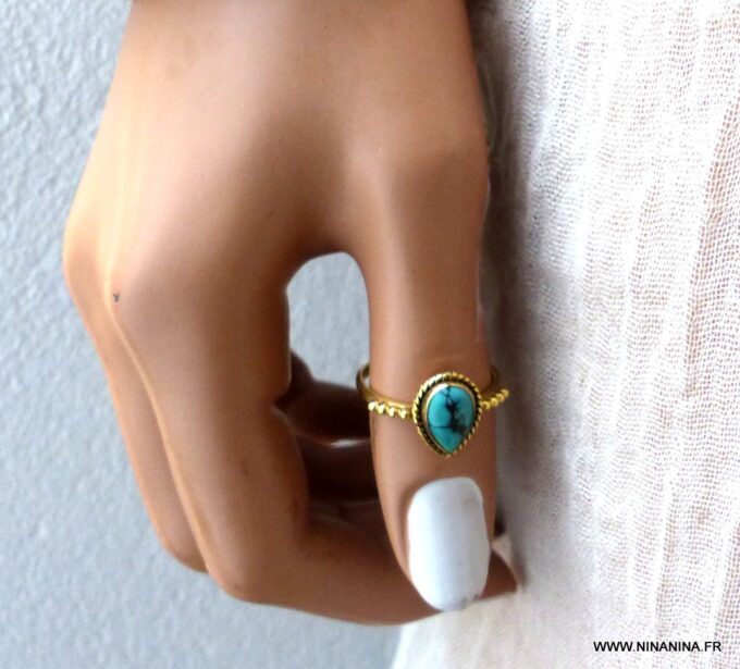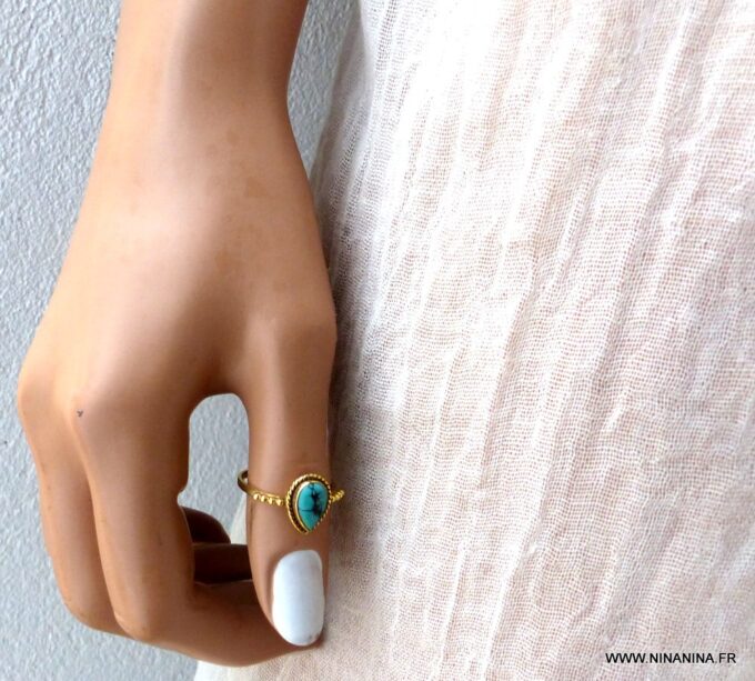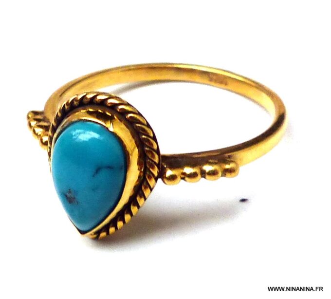Bague plaqué or pierre Turquoise naturelle plaqué or de forme goutte composée d’un cabochon en turquoise naturelle monté sur un anneau en argent 925.