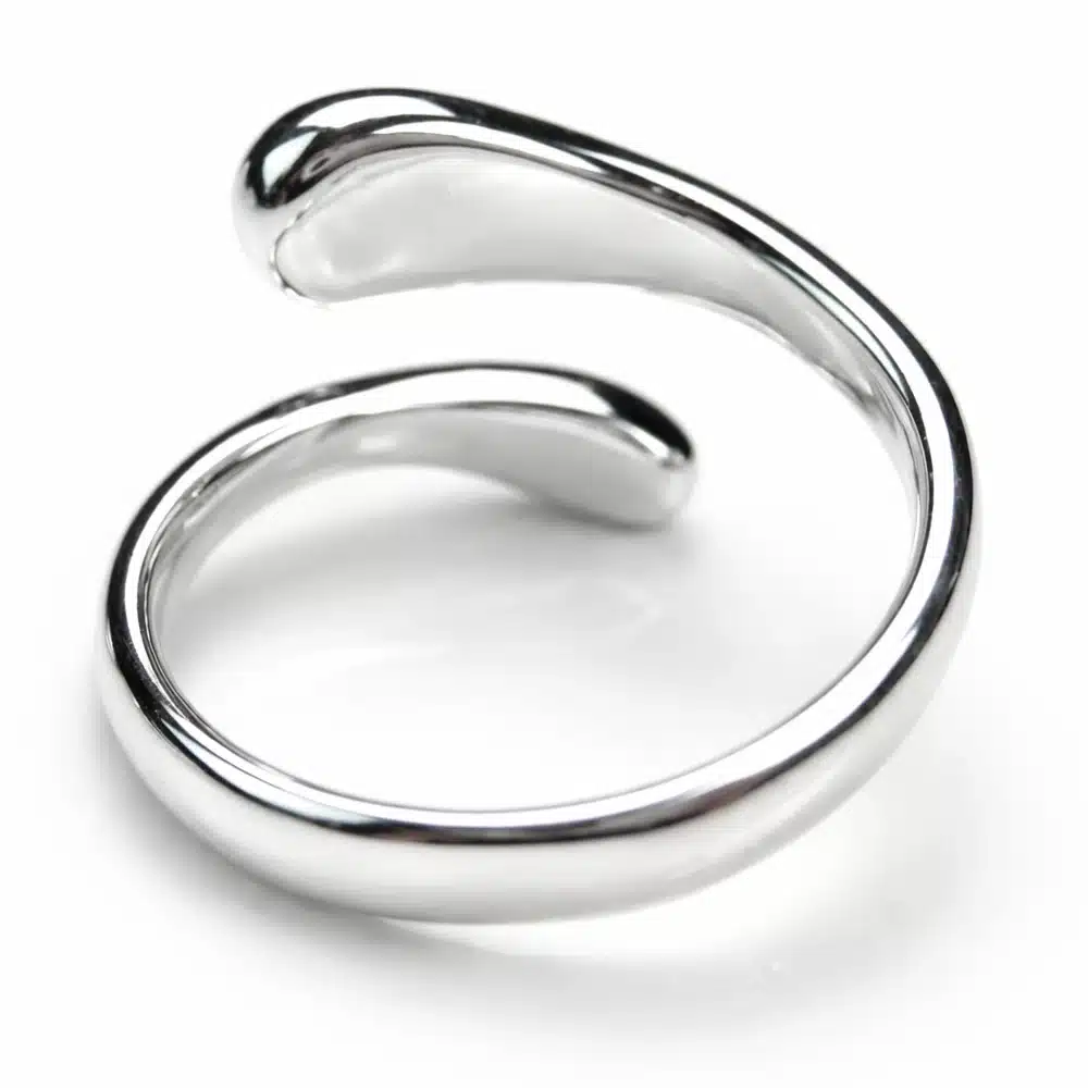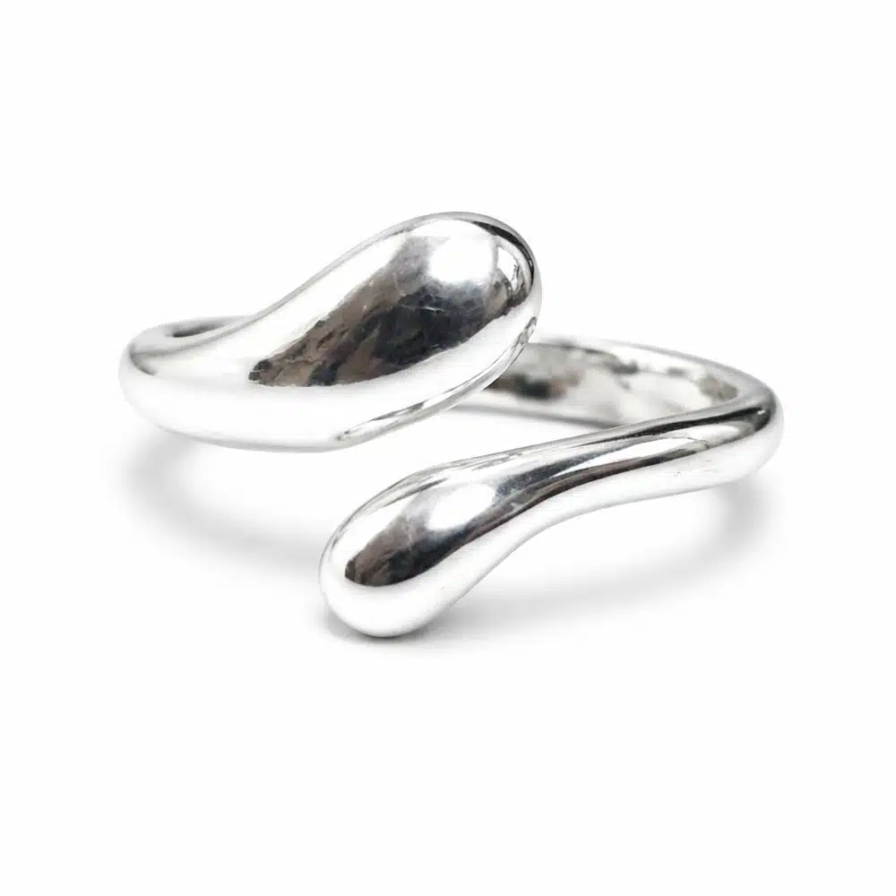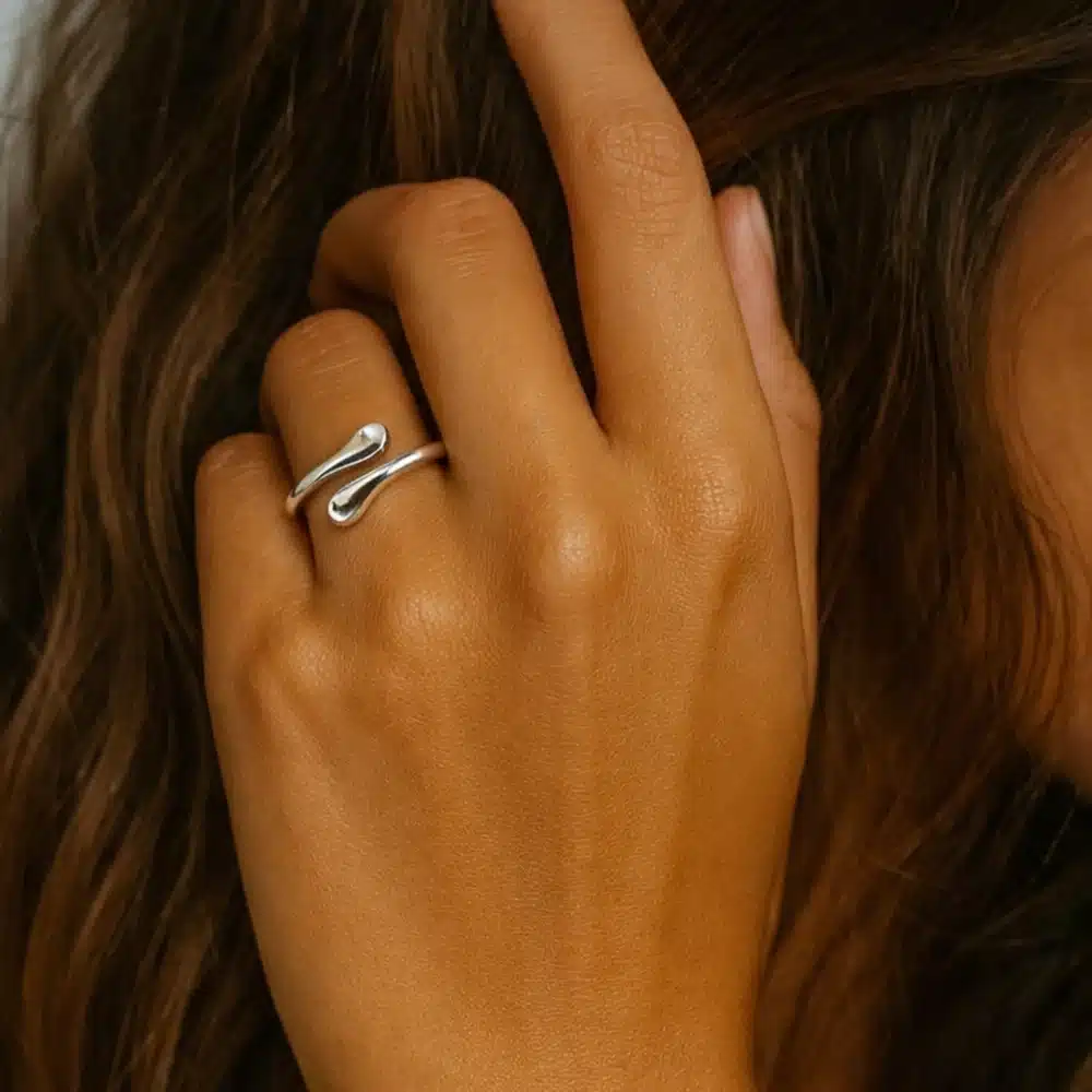 Les extrémités en forme de goutte, délicatement polies, apportent une touche de douceur et renforcent l’esthétique minimaliste de la bague. Leur finition lisse capte subtilement la lumière et met en valeur l’éclat de l’argent plaqué. Le jonc, aux lignes fluides et harmonieuses, s’inscrit dans un style à la fois moderne et intemporel.