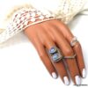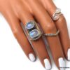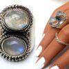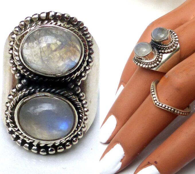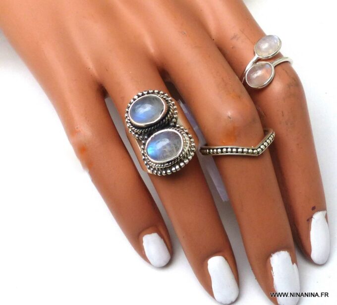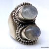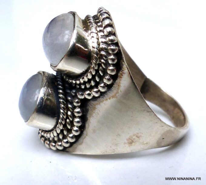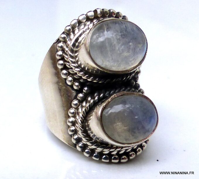 Grosse bague pierre de lune et argent 925 massif composée de cabochons ronds en pierre de lune naturelle montés sur un support ciselé en argent 925