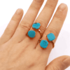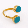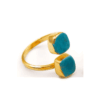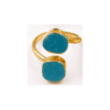 Bague 2 Cabochons Turquoise Plaqué Or ajustable pour femme composée de 2 turquoises véritables ovales montées sur une bague en plaqué or 24 carats. Hauteur : 2 cm env. Diamètre : 1,9 cm réglable. Livré dans sa pochette d’organza. Bijou 100% fait-main. Poids : 3 g