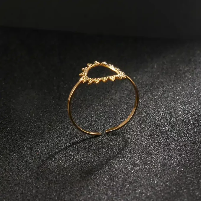 Cette bague féminine est ornée d’un motif soleil distinctif. Les rayons du soleil sont finement détaillés, ajoutant une touche d’élégance à la conception globale de la bague. Cette bague brille d’une couleur dorée lumineuse, indiquant qu’elle est bien polie. L’acier doré est connu pour sa durabilité et sa résistance à la rouille et à la ternissure. La structure ouverte de la bague permet un ajustement facile pour s’adapter à différentes tailles de doigts. Cela rend la bague versatile et confortable à porter.