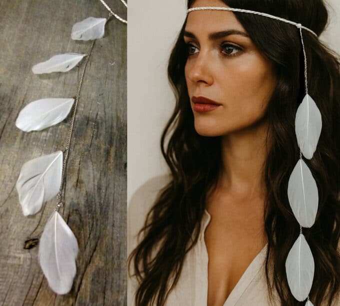 Un headband bohème chic en cordon de cuir blanc orné de longues plumes blanches. Léger, poétique et élégant, il illumine toutes vos coiffures avec une touche de pureté et de liberté.