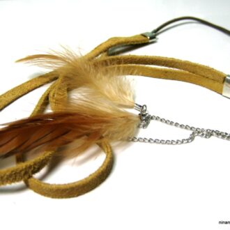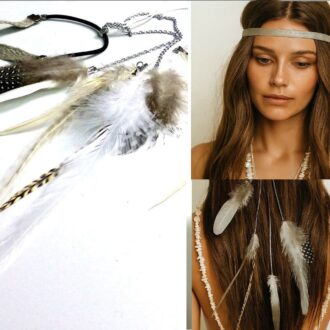 Son cordon en cuir tressé, souple et confortable, s’orne de plumes naturelles finement sélectionnées pour leur douceur et leurs nuances subtiles.