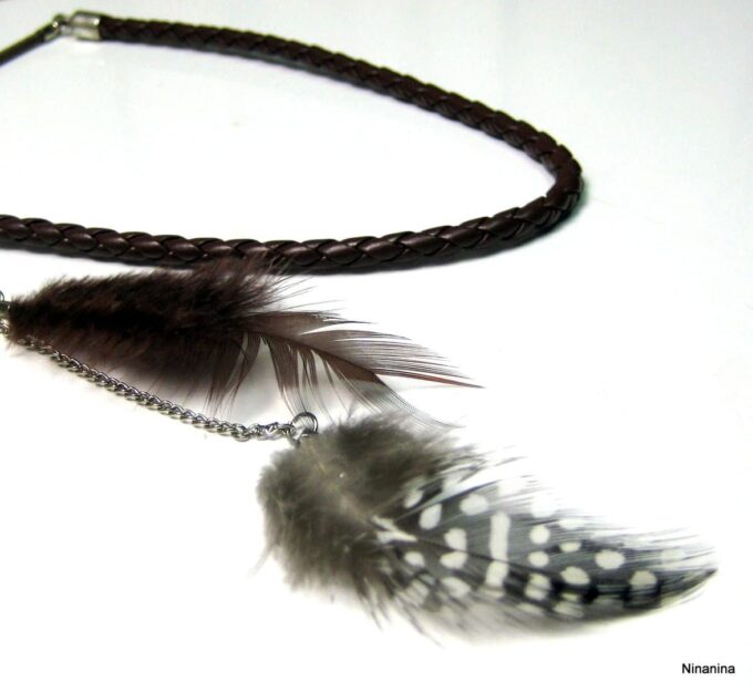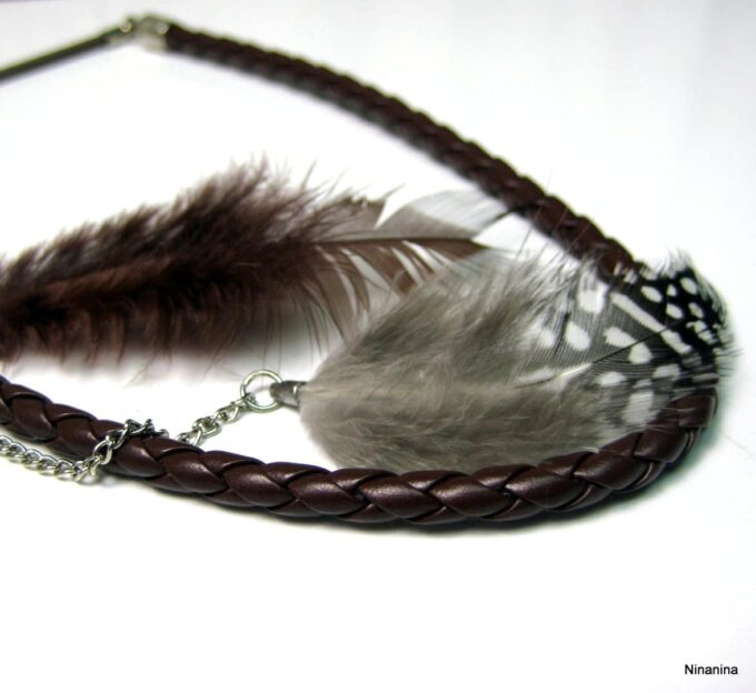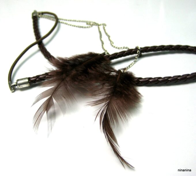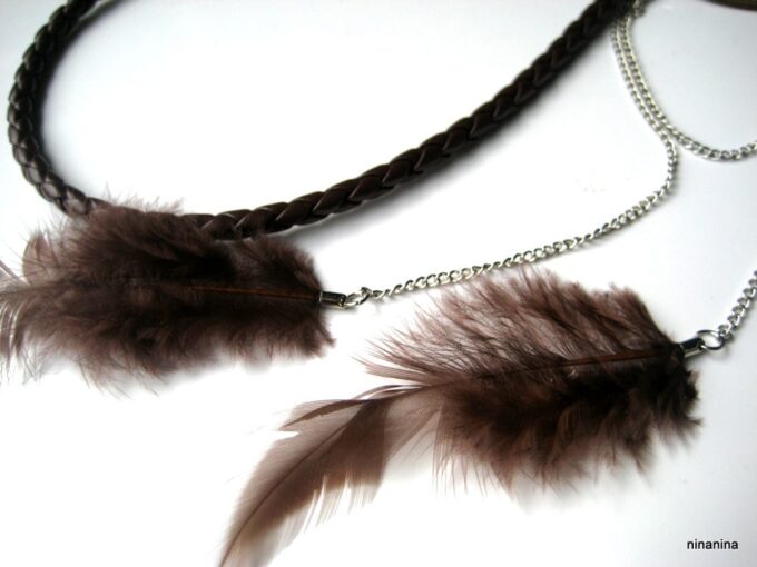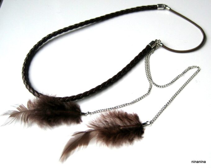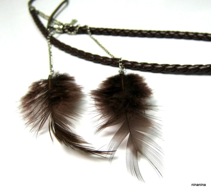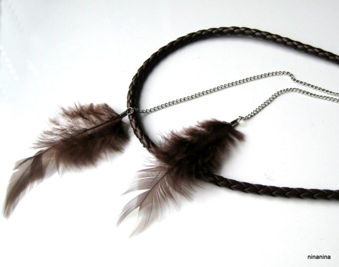 Apportez une touche bohème chic à votre look avec ce headband femme en cuir tressé et plumes marron. Un accessoire naturel, élégant et tendance, signé NinaNina.