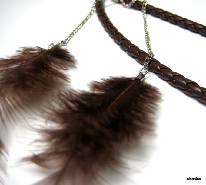 • Matières : cuir tressé, plumes naturelles, chaîne fine en métal doré