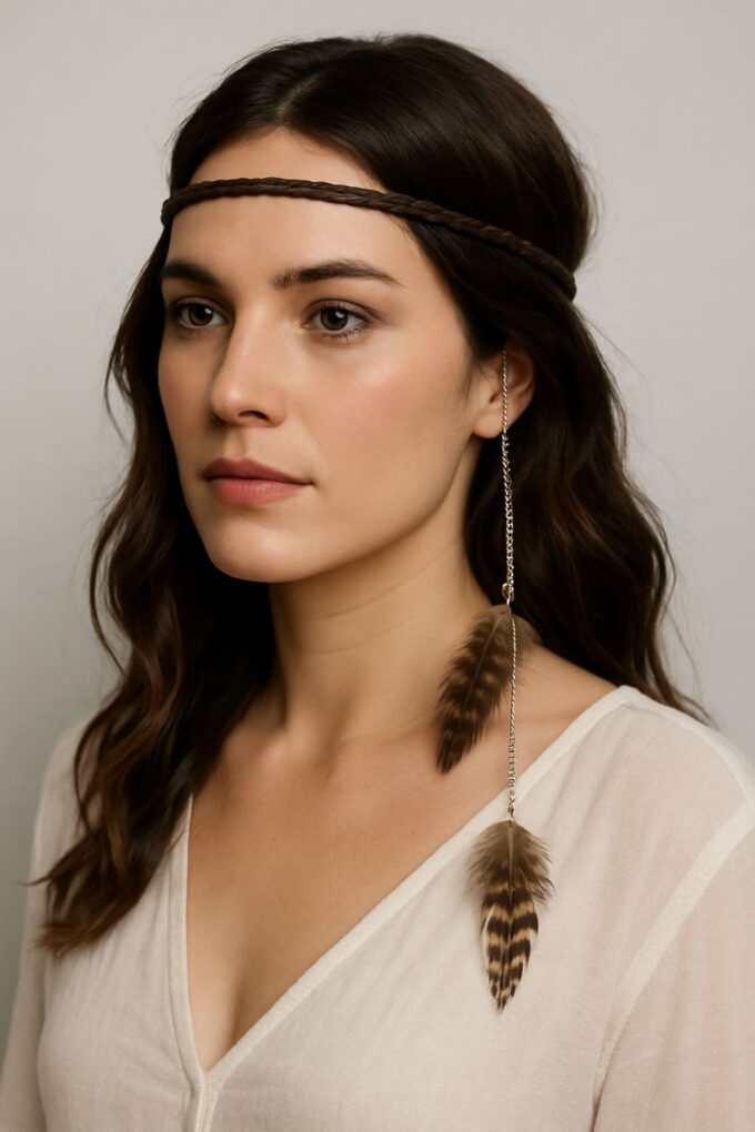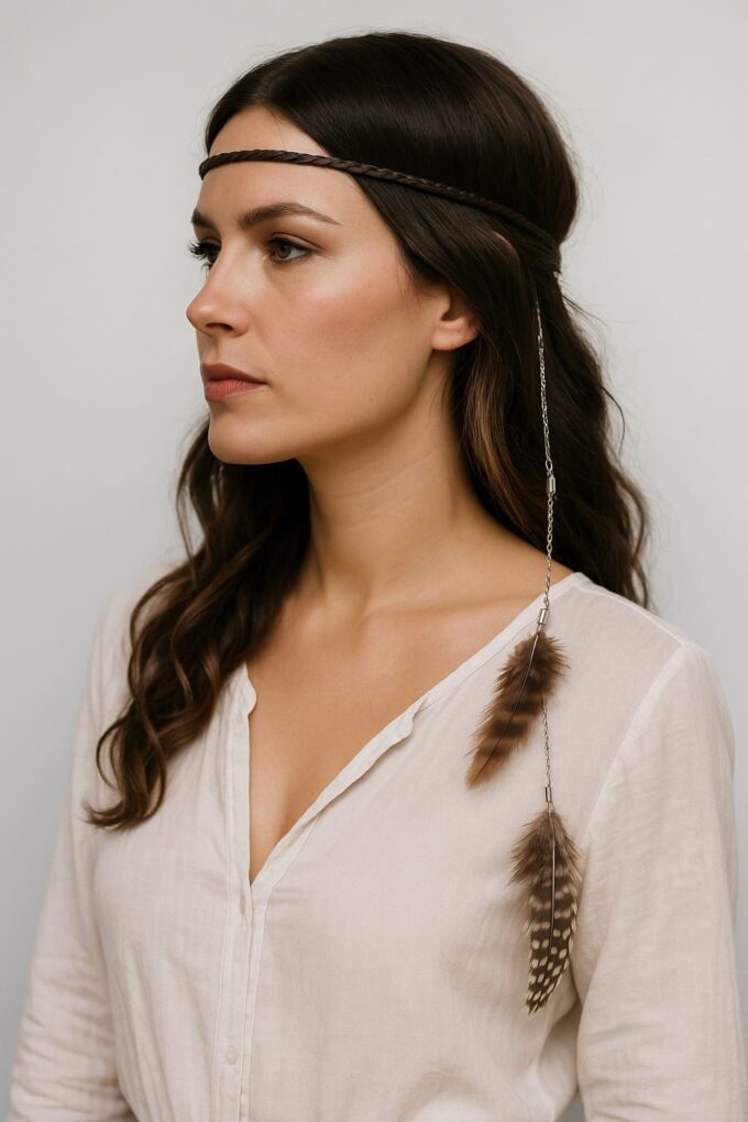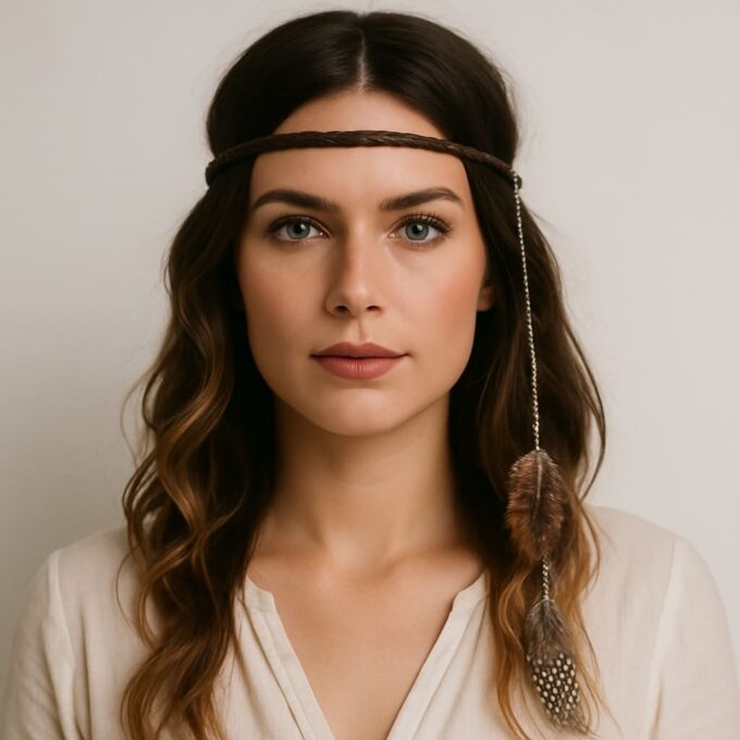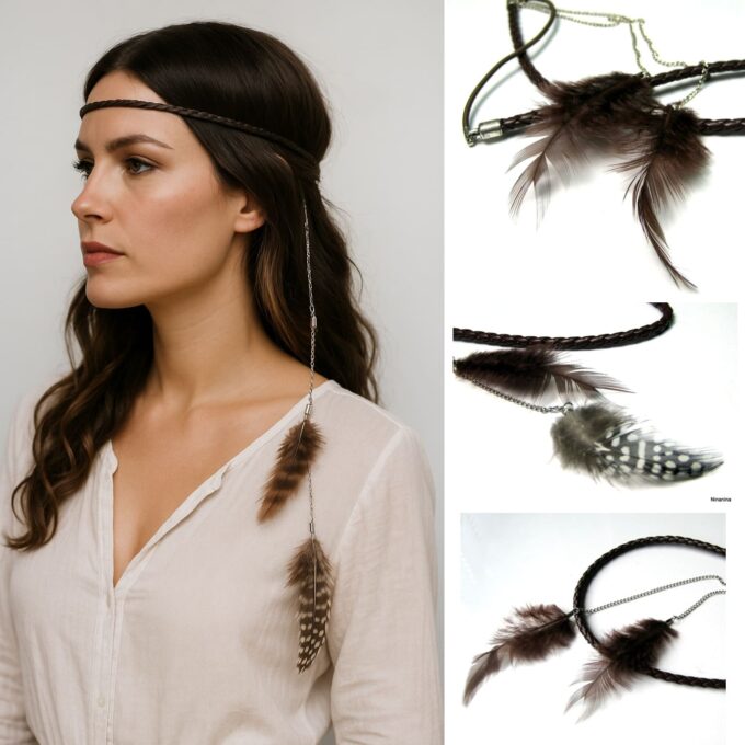 Ce head band femme cuir tressé avec plumes évoque la liberté et l’élégance des looks bohèmes.