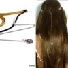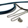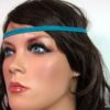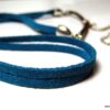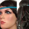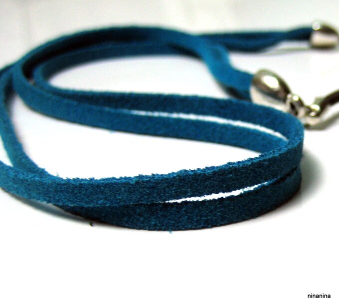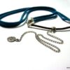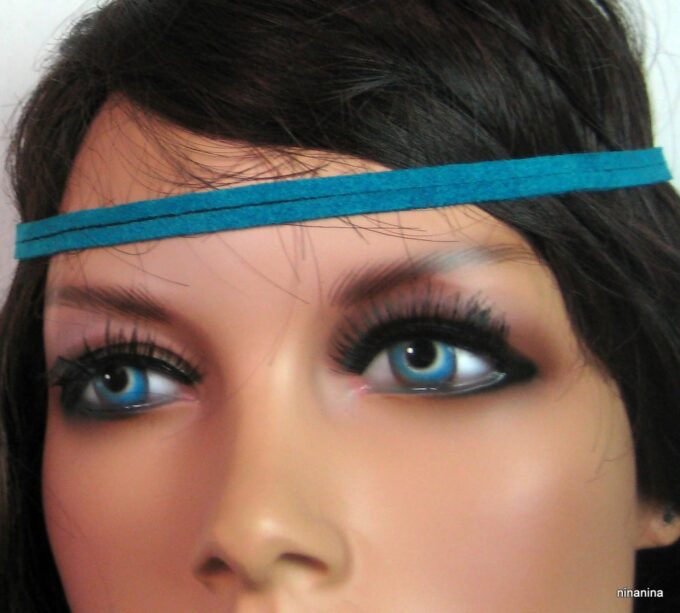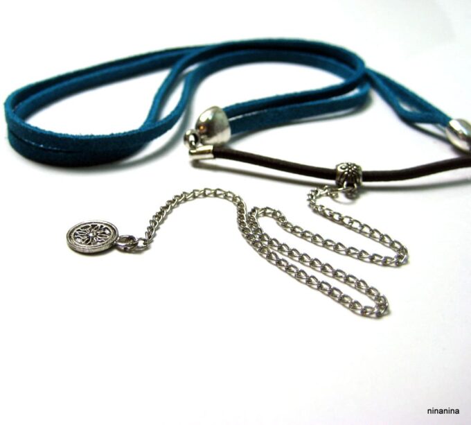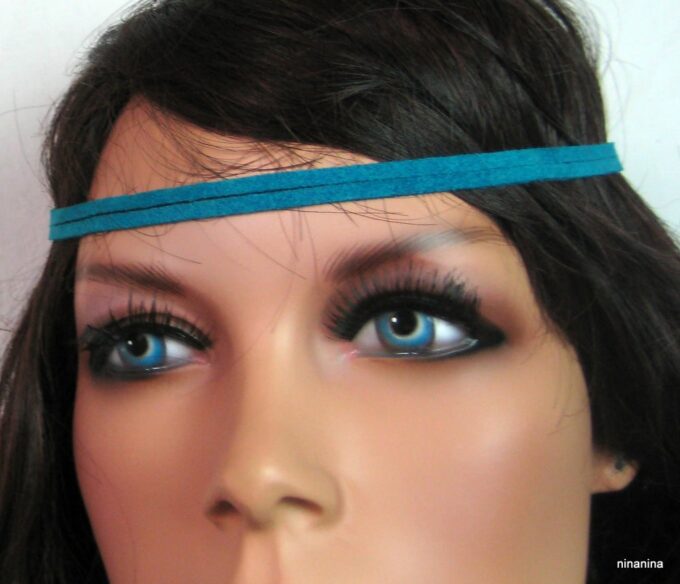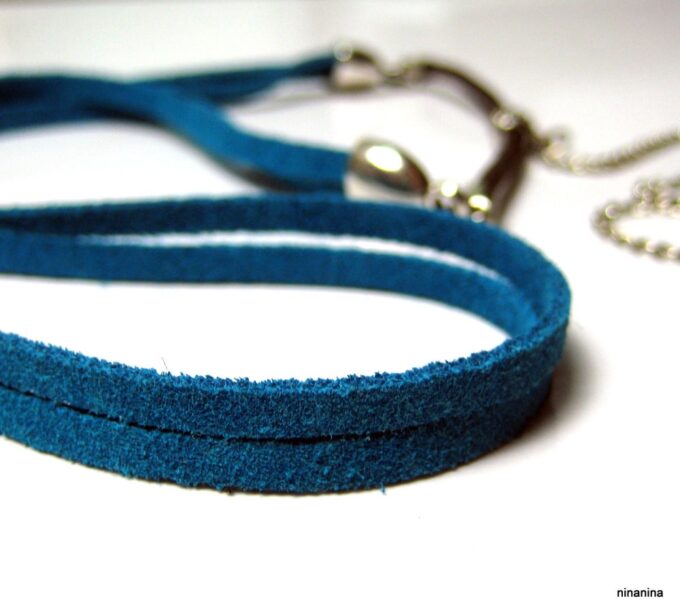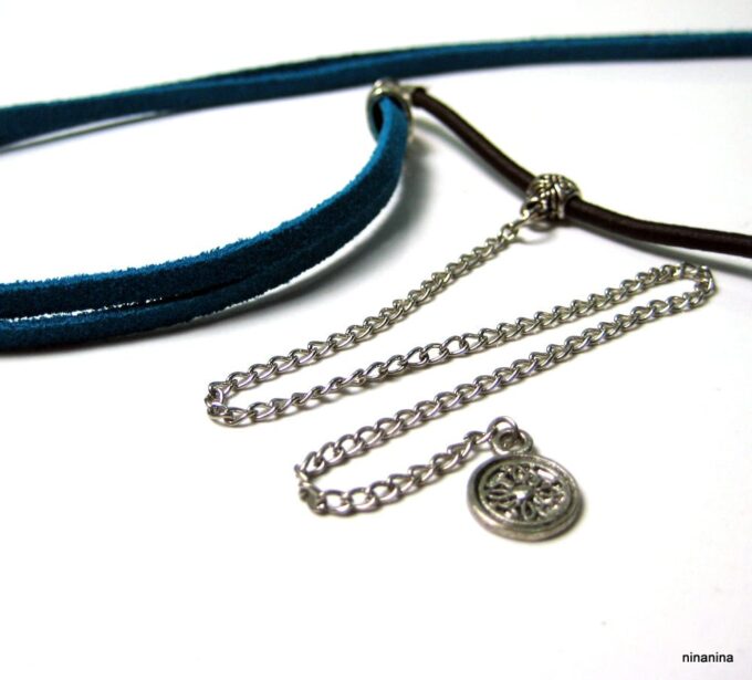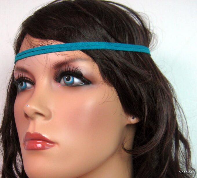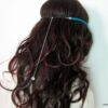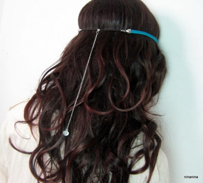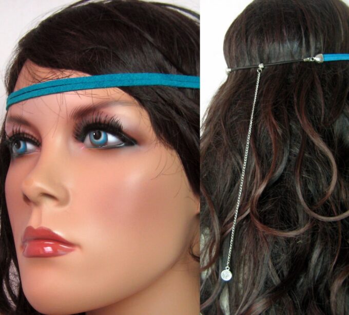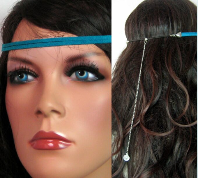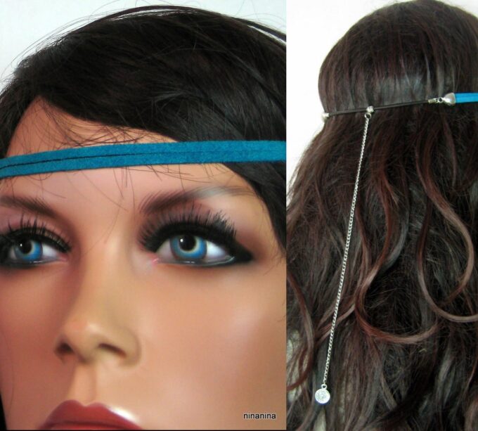Headband daim et acier inoxydable composé de deux lanières de daim naturel (3mm de large) fermées par un lien elastique et terminées par une chainette en acier inoxydable et un sequin rond. Existe aussi avec daim turquoise, rouge et marron chocolat. – Longueur de la chainette : 20 cm env.