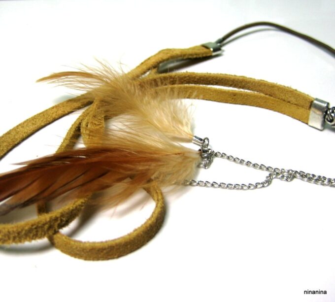 Sa double lanière de daim, souple et confortable, s’orne de plumes naturelles finement sélectionnées pour leur douceur et leurs nuances subtiles.