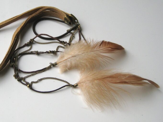 Headband Gipsy Lanière En Daim Véritable Et Plumes Naturelles Femme