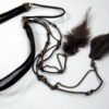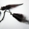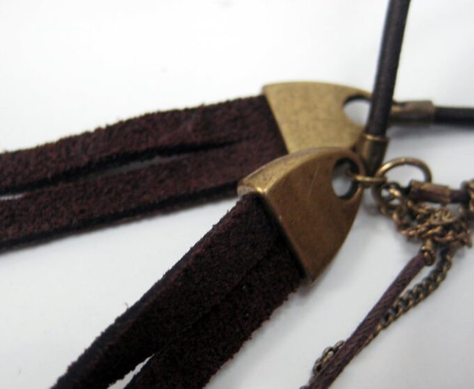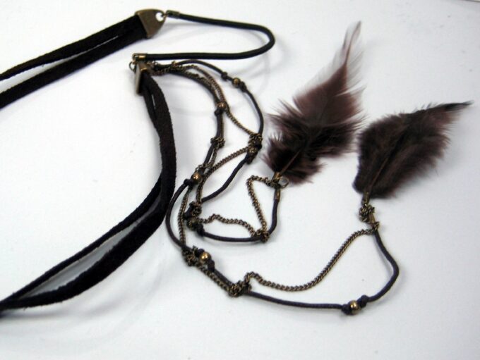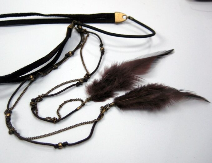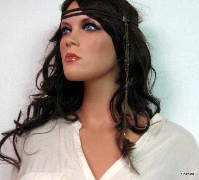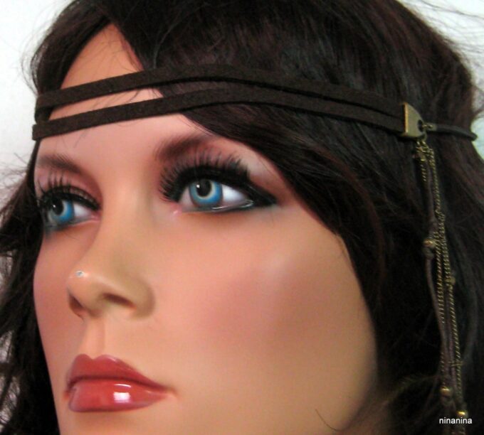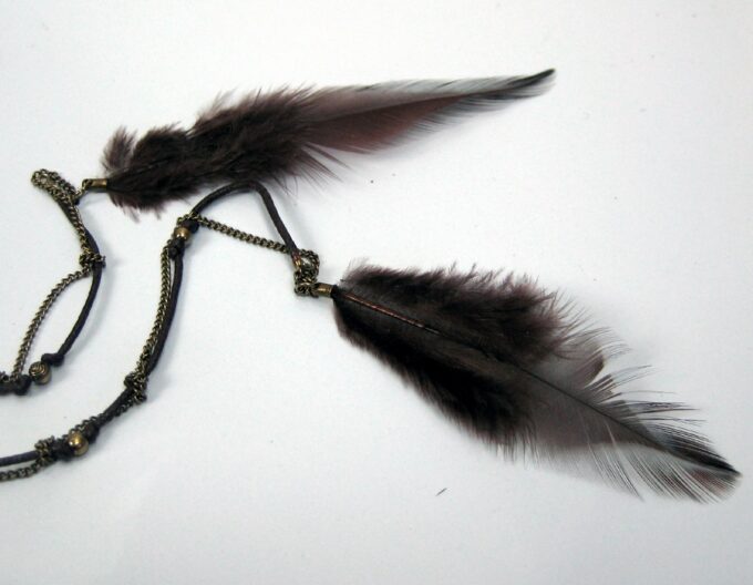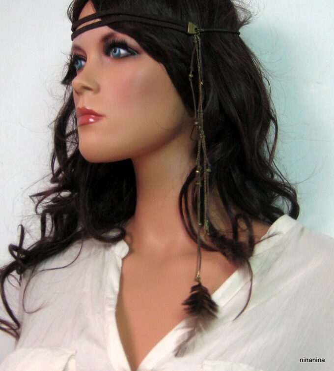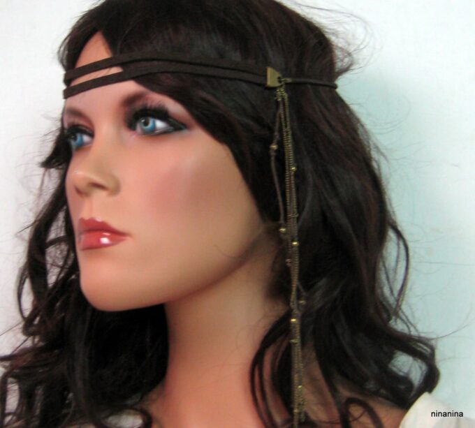 Headband Cuir Daim et chainettes métal bronze composé d’une lanière double de daim marron chocolat (10 mm de large) et deux plumes marrons chocolat montées sur cordon de coton marron et chainette en laiton (métal bronze). Existe aussi en daim naturel/plumes marron clair et en daim noir/plumes noires. Fermeture elastique. Livré dans sa pochette d’organza. Bijou 100% fait-main.