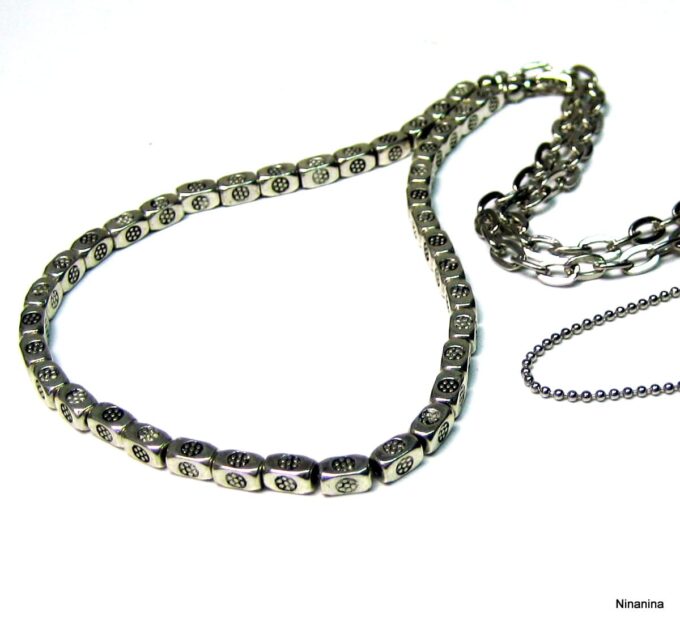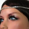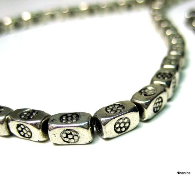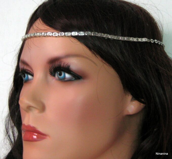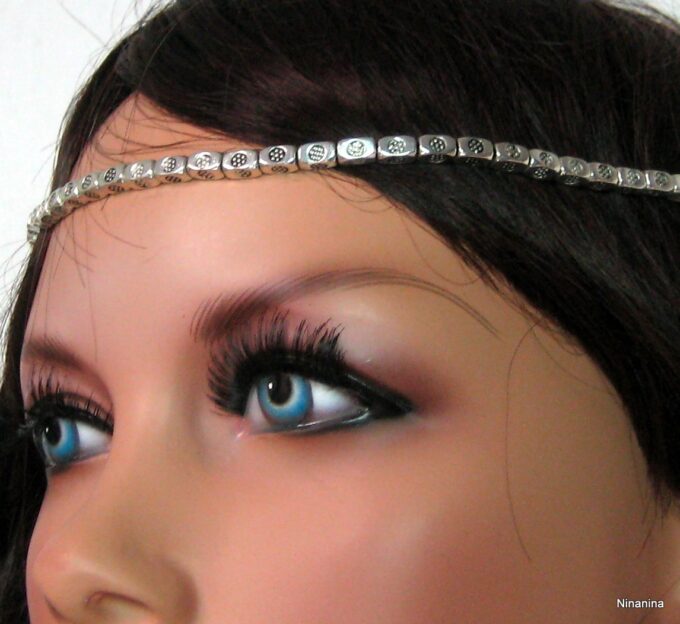 Headband Metal argenté perles rectangulaires gravées fleur composé de perles ciselées rectangulaires en métal argenté montées sur une chainette en métal argenté. Longueur : 53 cm env ajustable. Livré dans sa pochette d’organza. Bijou 100% fait-main.