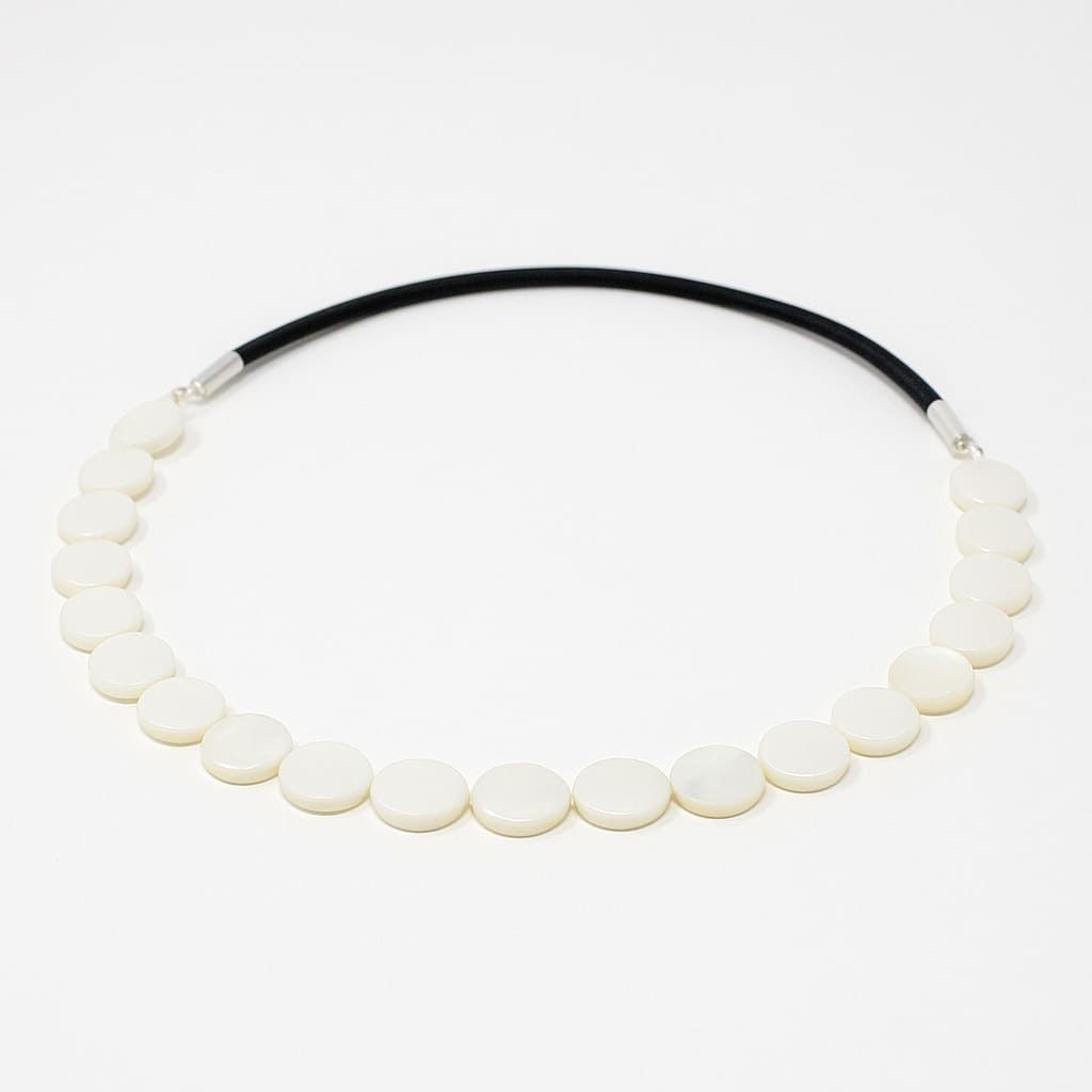 Ses perles rondes plates en nacre blanche naturelle diffusent une lumière douce et subtile, parfaite pour illuminer le visage avec élégance.