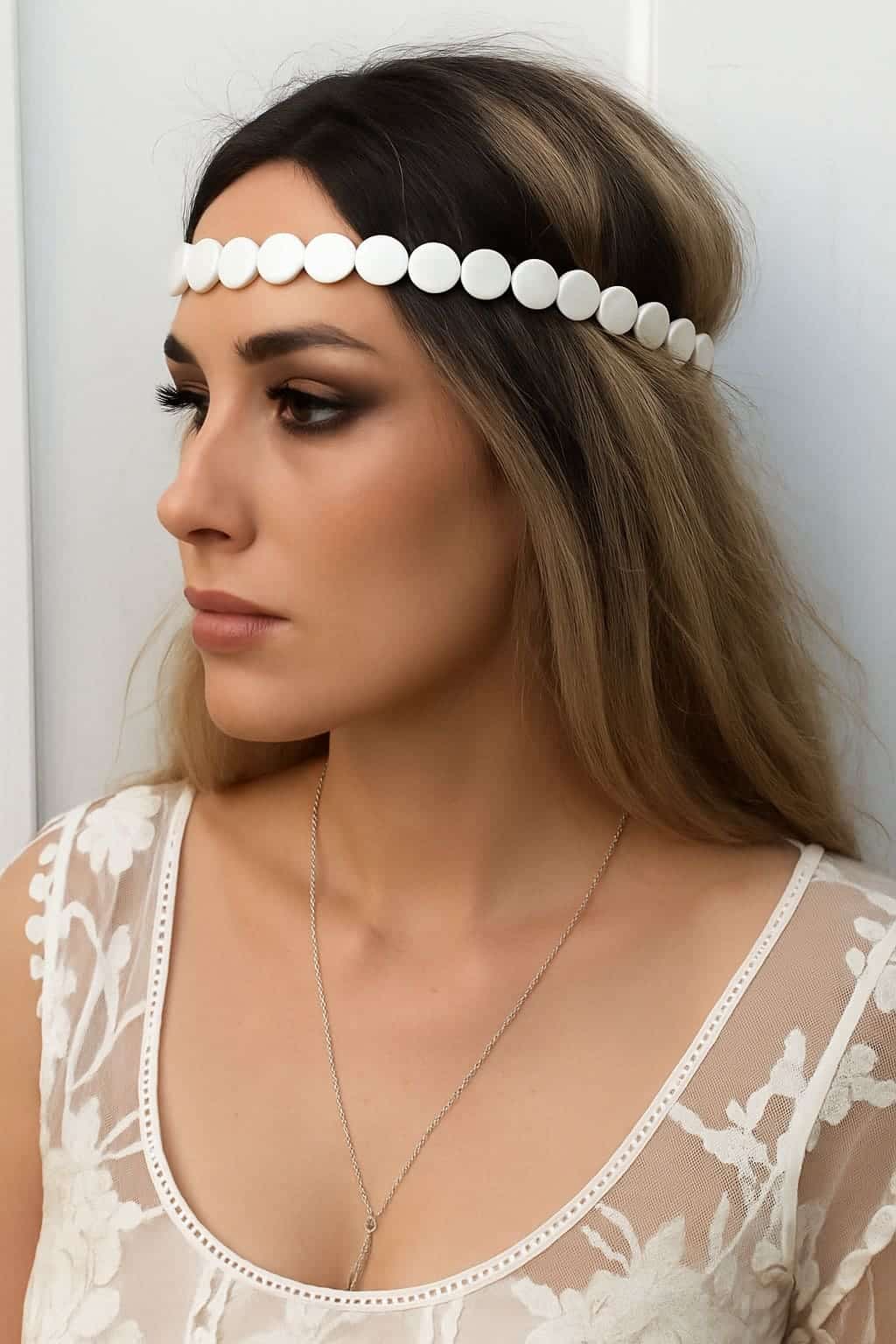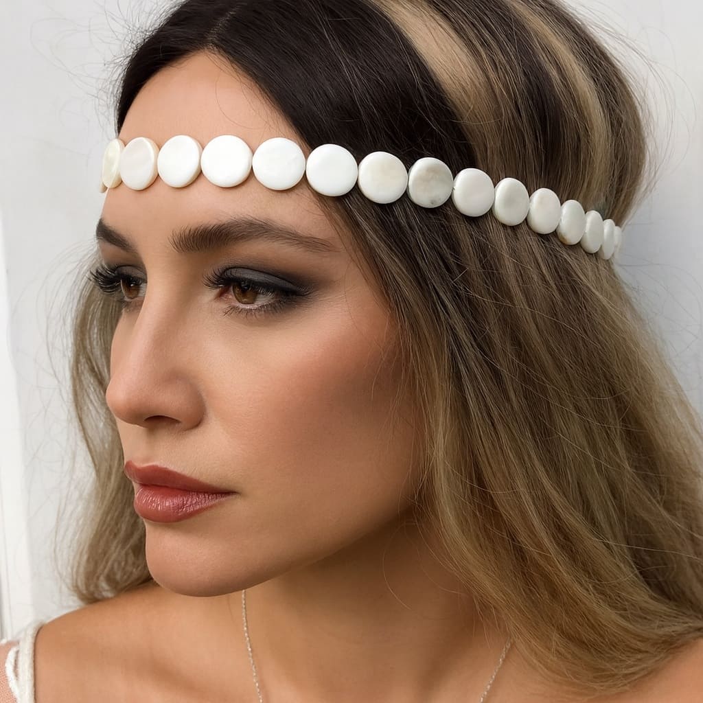 Le headband blanc femme perles rondes plates de nacre blanche est bien plus qu’un accessoire : c’est une touche de lumière et de grâce pour vos cheveux.