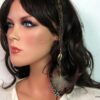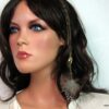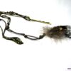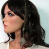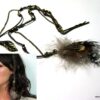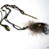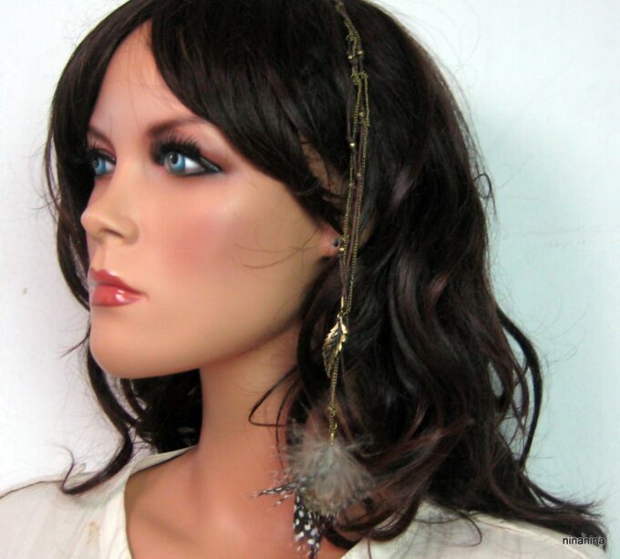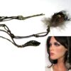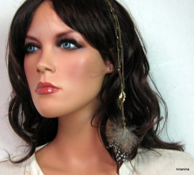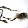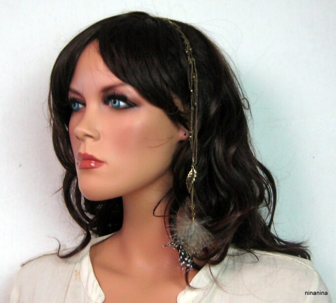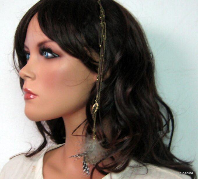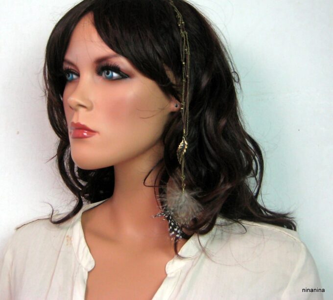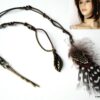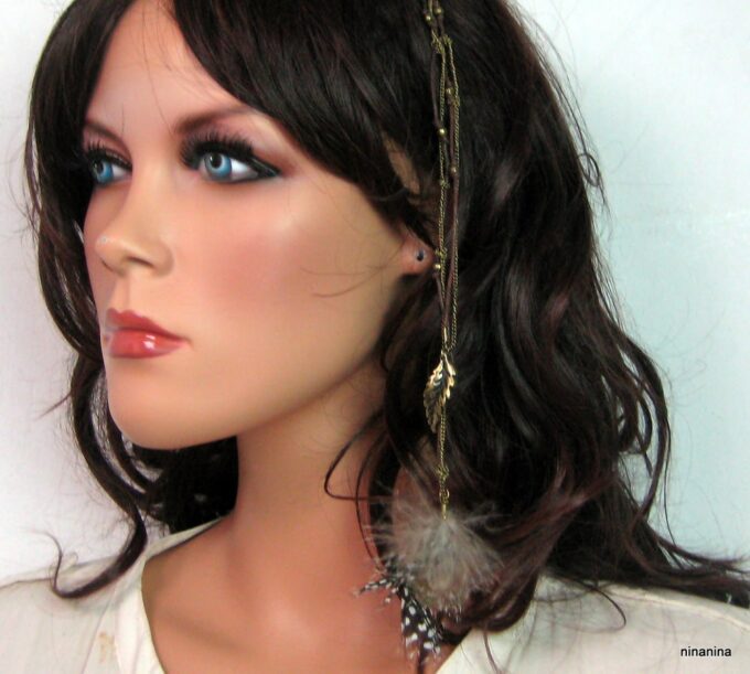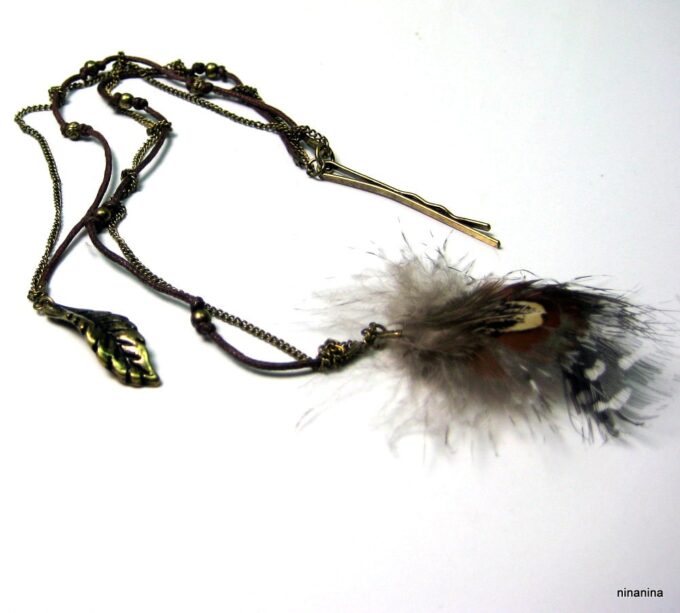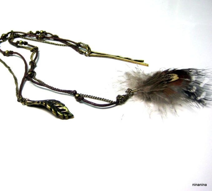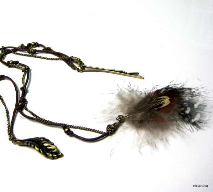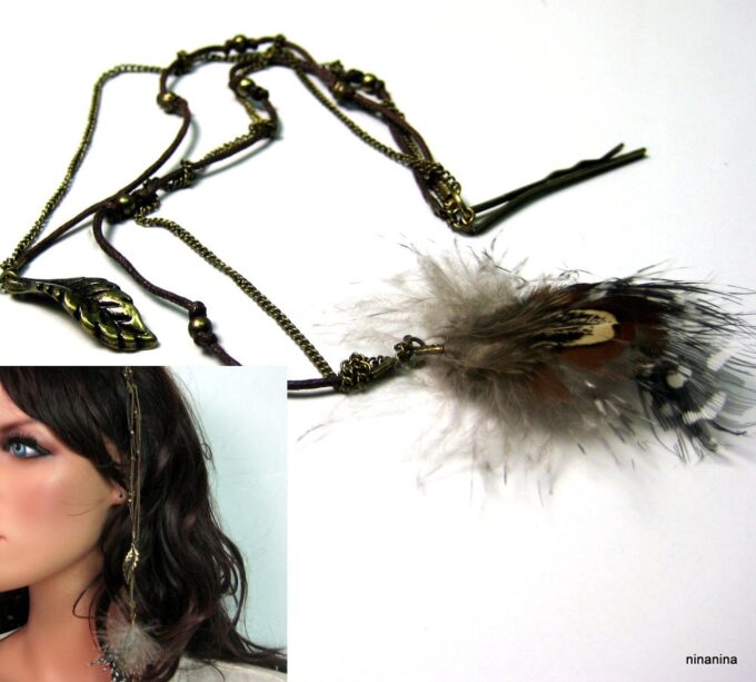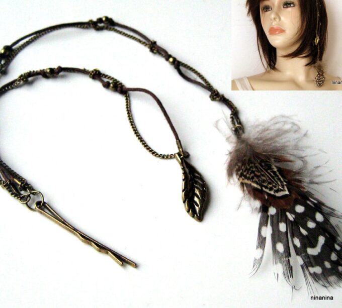 Bijou de cheveux plumes métal bronze composé d’une plume en métal bronze et de plumes montées sur fine chainette boule et lien de coton ciré marron terminées par une barrette. Longueur : 29 cm environ. Livré dans sa pochette d’organza.