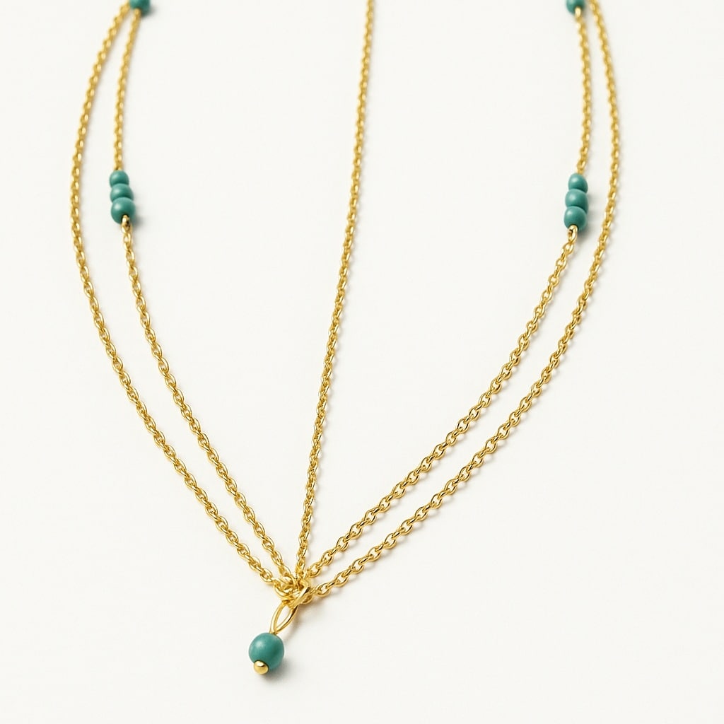 Les perles de turquoise naturelle symbolisent la protection et la sérénité, tandis que le doré évoque la chaleur et la lumière solaire.