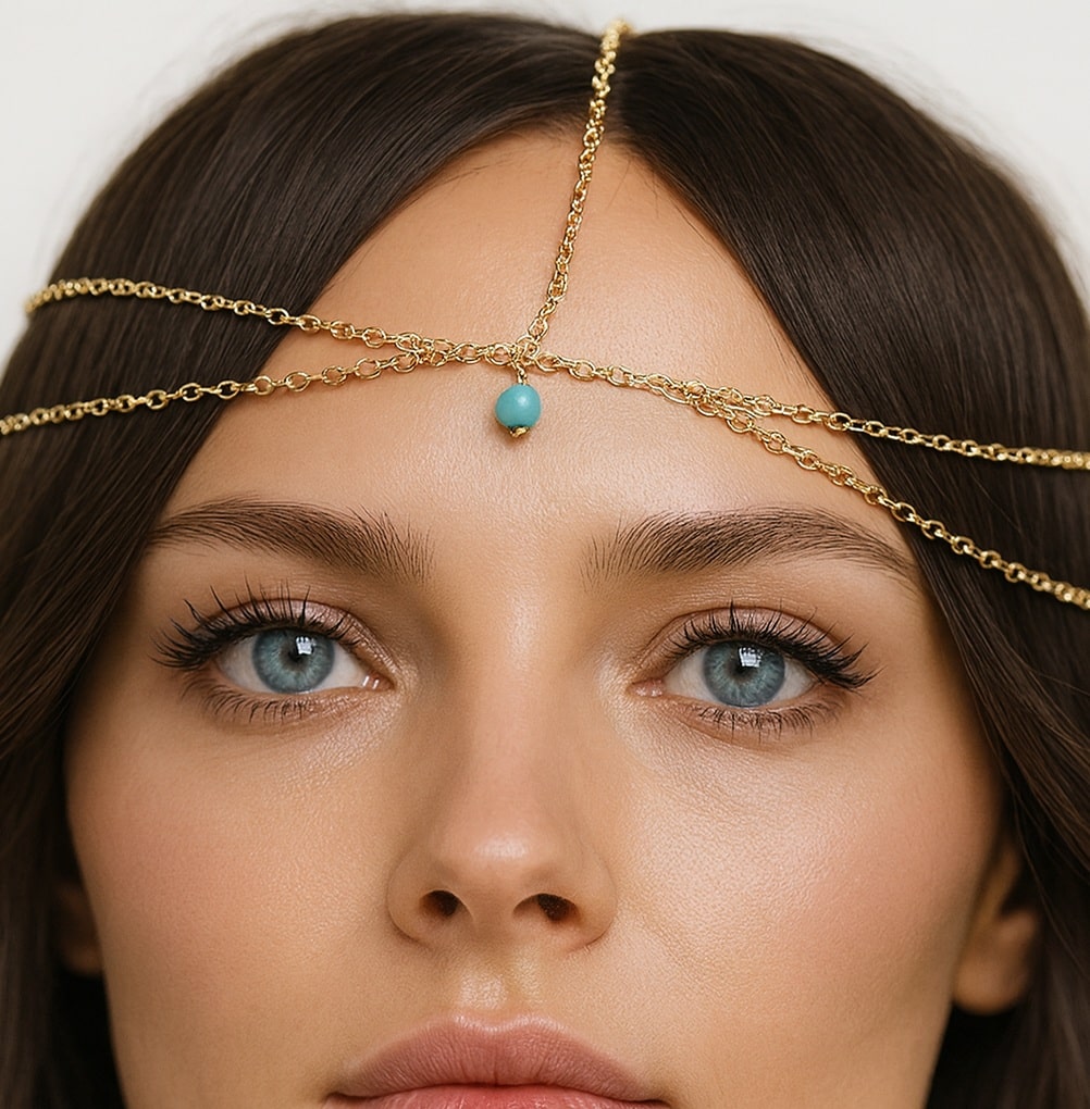 Sublimez vos coiffures avec cette chaine de tête artisanale en acier inoxydable doré, ornée de perles véritables de turquoise naturelle.