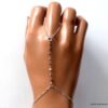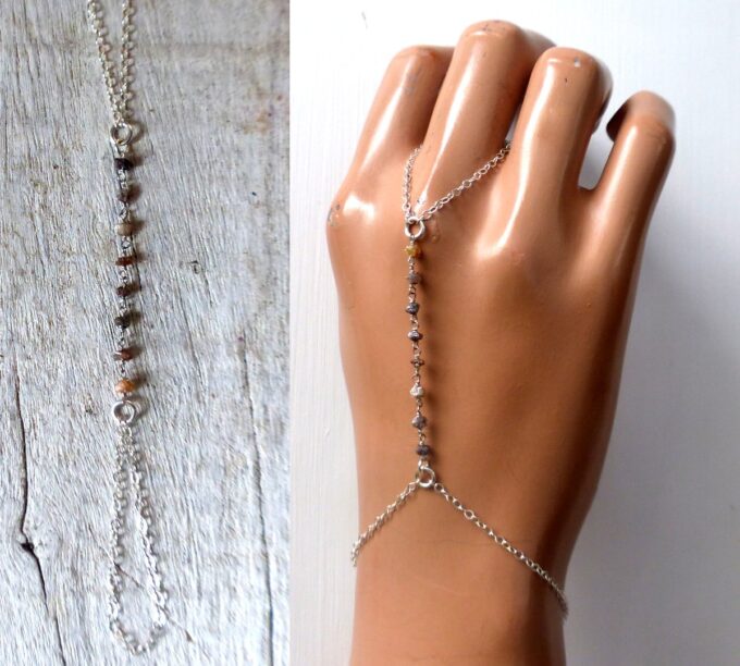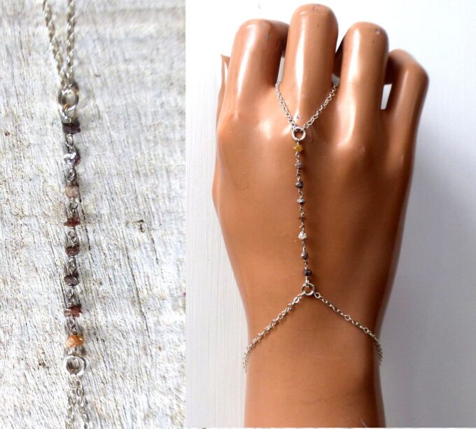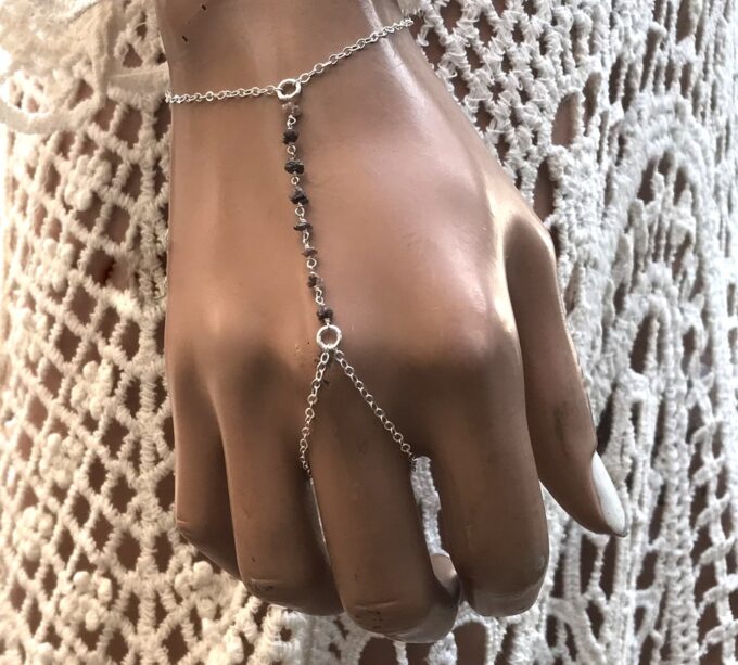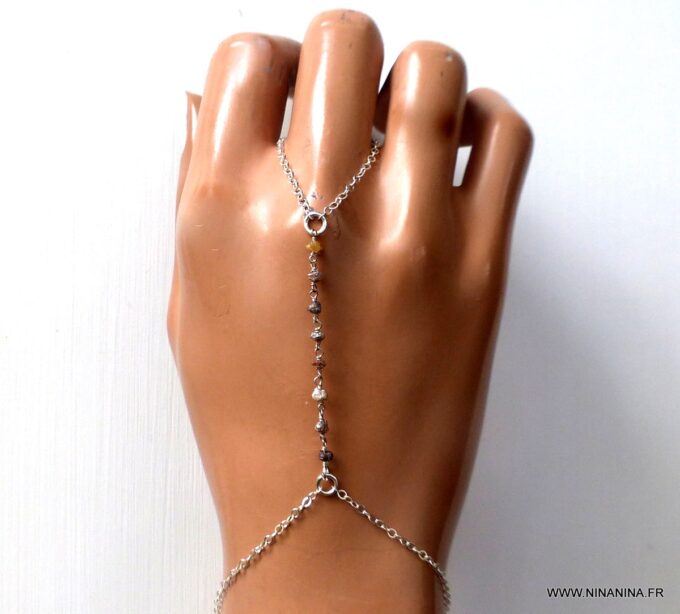 Splendide, délicat et raffiné, ce Bijou de main Argent 925 et diamant brun brut apportera douceur et lumière à votre poignet. Il composé d’un bracelet (au niveau du poignet) relié à une bague par une chainette en argent 925 qui affine le tout… De petites pépites en diamant brun brut habillent feront briller de mille feux le dos de votre main. Un bijou en diamant précieux et très original qui délivre toute sa finesse, et vous fera tout simplement craquer !